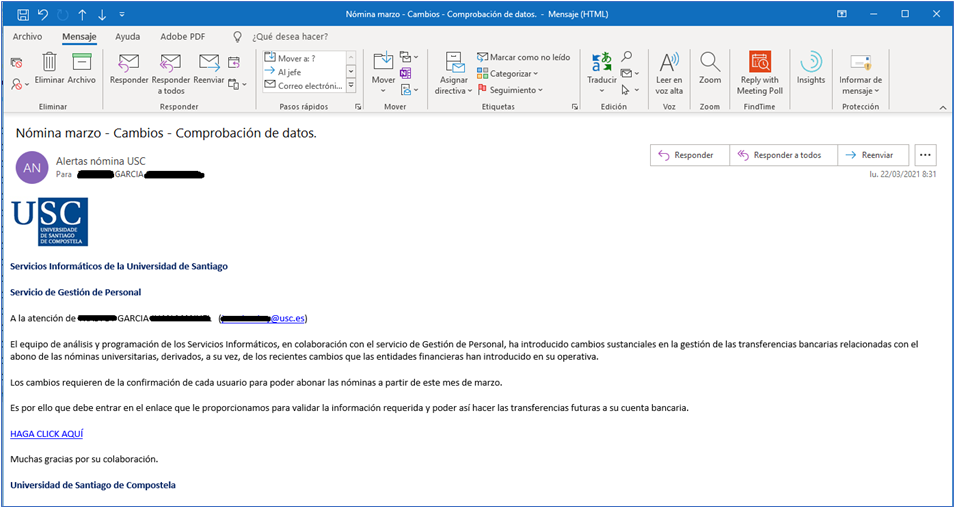 O persoal recibía un correo electrónico informando dun cambio na forma de aboamento da nómina de marzo. Solicitaba unha confirmación de datos premendo nunha ligazón. A mensaxe, supostamente, proviña do Servizo de Xestión de Persoal e duns hipotéticos “Servizos Informáticos” da USC e tiña como remitente unha dirección inventada alertasnominausc [at] usc.es (alertasnominausc[at]usc[dot]es), co texto “Alertas nómina USC”. O asunto era “Nómina marzo - Cambios - Comprobación de datos”.