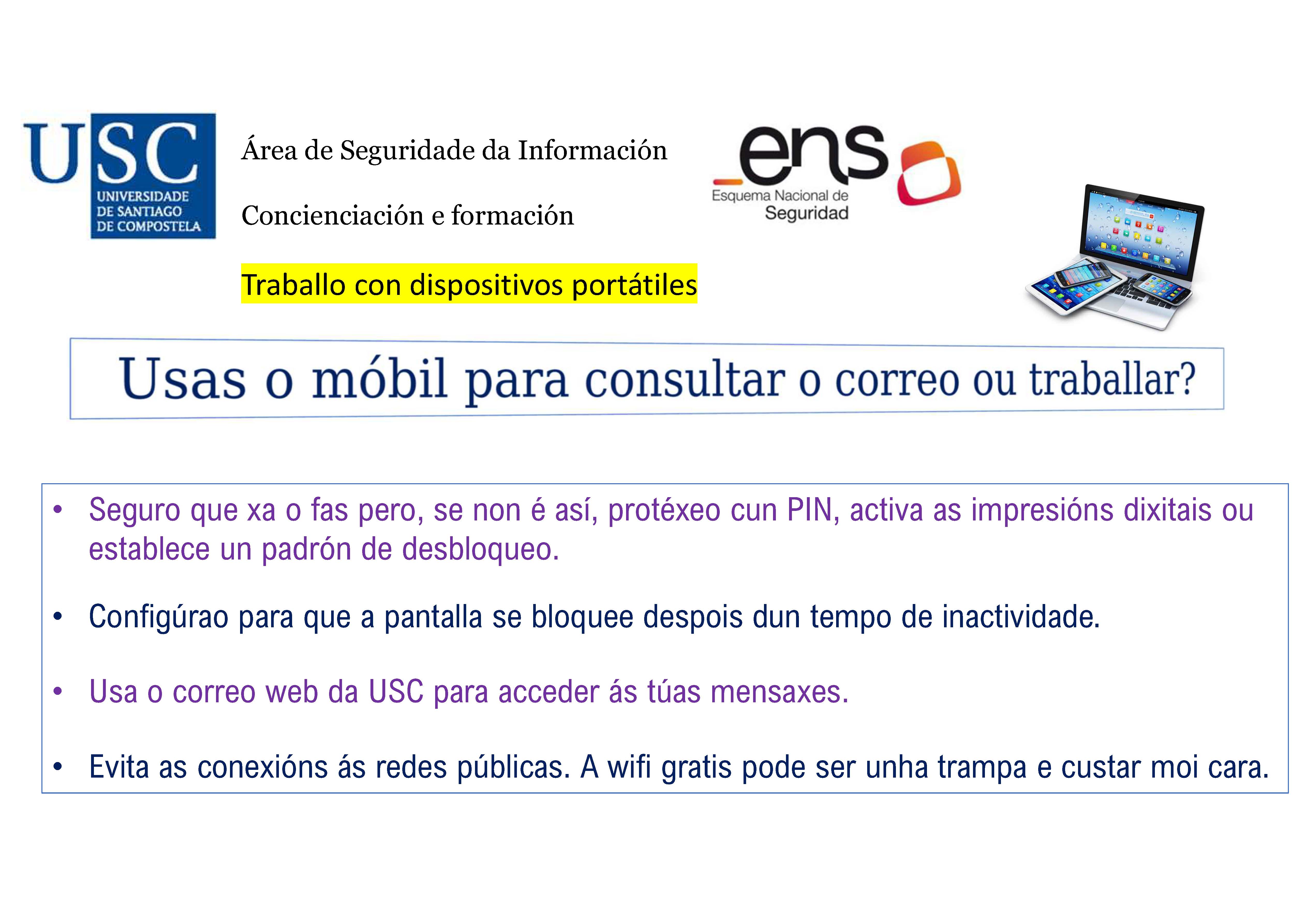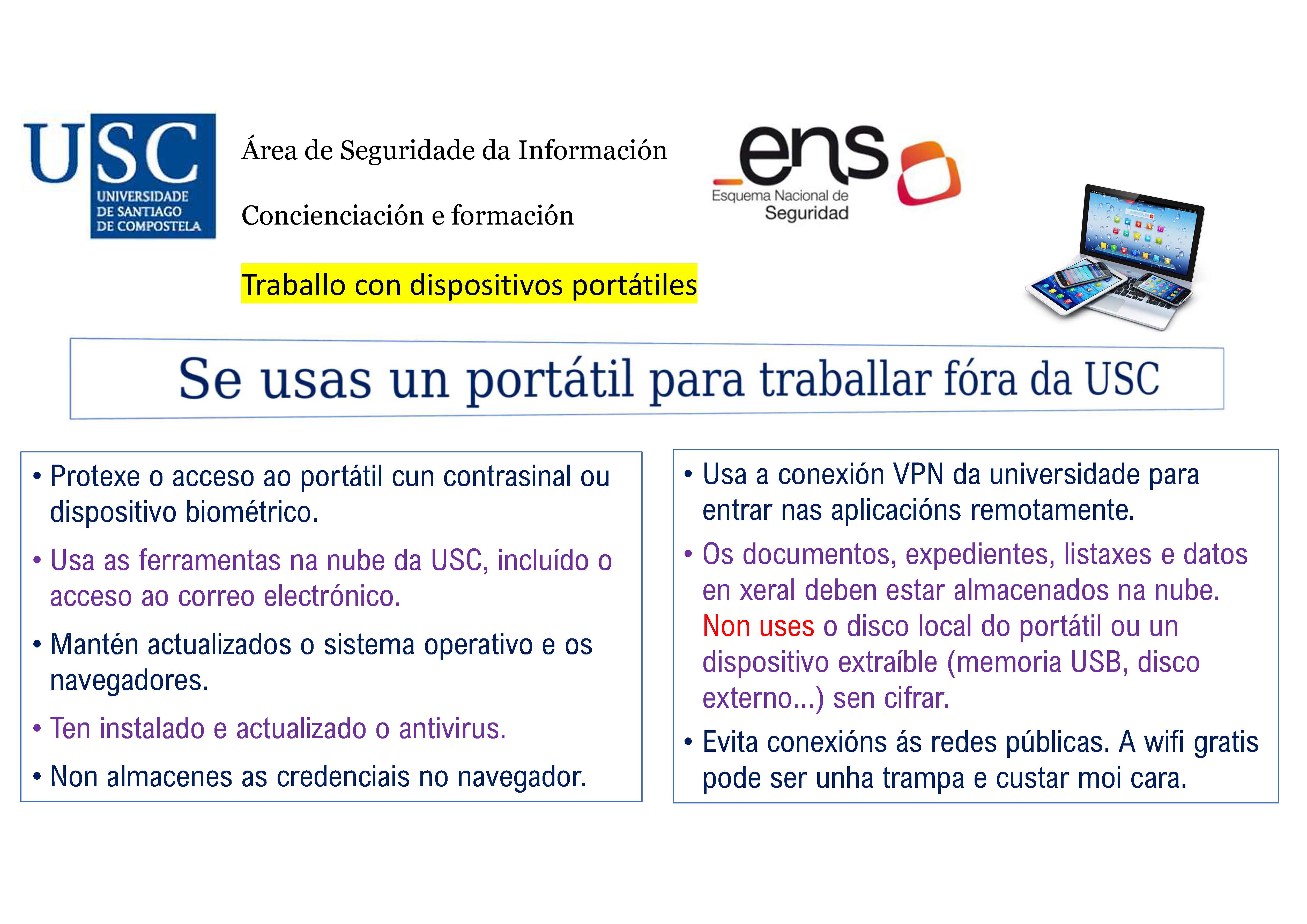 Dentro da USC dispoñemos dunha protección máis ampla (nunca total, por suposto), xa que contamos cos dispositivos e programas dedicados exclusivamente á seguridade que vixían e defenden a nosa rede e os nosos servidores, pero fóra dela é un mundo diferente. As redes sen fíos que non teñen seguridade adicional, as transmisións de datos por canles non fiables, a perda ou roubo dos propios dispositivos e moitas outras que son propias dos desprazamentos, póñennos en situacións ante as que non podemos contar coa protección da USC e debemos preocuparnos por mellorar a nosa propia seguridade.