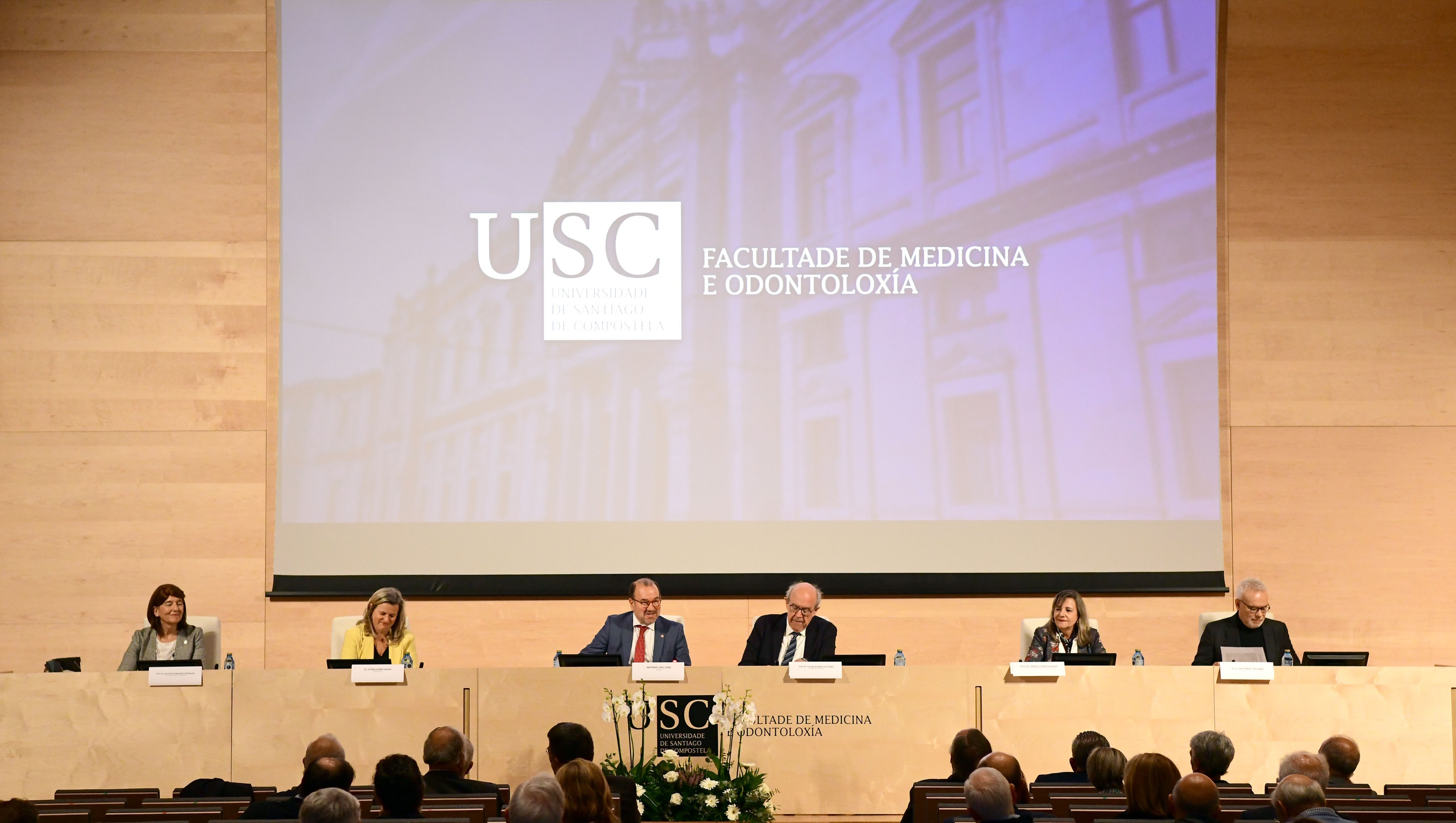 Ademais do reitor tamén interviñeron no acto o decano Julián Álvarez Escudero, a xerente do Hospital Clínico, Eloína Núñez Masid; a vicedecana de Intercambios Innovación Docente e Calidade, Ángela Torres Iglesias; e a secretaria académica, Mª del Pilar Fernández Rodríguez, quen deu lectura á entrega de Placas Honoríficas. A lección maxistral titulada ‘O Médico Enfermo: de Quirón aos nosos días’ correu a cargo de Luis Ferrer i Balsebre.