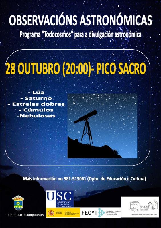 O programa de divulgación astronómica TodoCosmos levará a cabo este sábado 28 unha sesión de observación pública dende o Pico Sacro a partir das 20.00 horas. As persoas que se acheguen observarán a Lúa, o planeta Saturno, unha estrela dobre, o cúmulo globular M13 e a nebuloso do anel. TodoCosmos é unha iniciativa desenvolvida polo Observatorio Astronómico Ramón María Aller da USC e financiada pola FECYT. Neste ocasión conta coa colaboración do concello de Boqueixón.