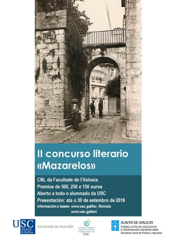 A segunda edición do concurso literario ‘Mazarelos’ está aberta á participación de todo o alumnado da USC que poderá achegar a súa proposta cunha obra de calquera xénero literario e tema, sempre que sexa orixinal e en lingua galega. O prazo para a presentación de orixinais rematará o 30 de setembro de 2016. Establécense tres premios de 500, 250 e 150 euros, que determinará un xurado composto por tres docentes da Facultade de Filoloxía e dous escritores/as sen relación actual co centro.