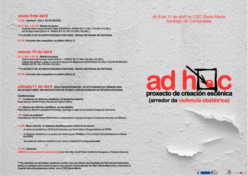 O proxecto de creación escénica AD HOC da Facultade de Ciencias da Educación e o seu laboratorio escénico Enlata -que aínda que co seu xermolo en 2007 foi en 2014 cando se puxo verdadeiramente en marcha como ciclo de teatro comunitario– volve esta semana aos escenarios. Nesta segunda edición catro compañías de teatro afeccionado aceptaron o desafío de traballaren en proxectos de creación escénica arredor do tema deste ano, a violencia obstétrica. Así, o xoves 9 será a quenda das pezas ‘Vostede estivo aquí’ de Enlata Teatro e ‘S/T’ de Iliria Teatro, mentres que o venres actuarán as compañías Farrapo Teatro e O aturuxo de Melpomene coas obras ‘Poñer a parir’ e ‘Fábula das galiñas, o gato e o can’, respectivamente. En cada unha das xornadas haberá tres pases por obra, en horario de tarde. As entradas son de balde pero deberanse recoller previamente nas secretarías da Facultade de Ciencias da Educación e nos centros socioculturais de Vite (ata este mércores) e Santa Marta. Xa o sábado 11 terá lugar unha serie de charlas impartidas por persoas expertas no tema a tratar que ademais foron as encargadas de achegar material e documentación para os dossieres sobre os que traballaron as compañías, neste caso a Asociación El parto es nuestro-O parto é noso e EDUCER. O proxecto AD HOC En 2007 a Facultade de Ciencias da Educación da USC iniciou o seu Ciclo de Teatro Comunitario, un proxecto que durante sete anos puxo todos os esforzos no labor de dar visibilidade ao traballo da agrupacións de teatro afeccionadas vinculadas a distintas estruturas comunitarias. Co ciclo xa consolidado, en 2014 e en colaboración con Enlata decidiuse iniciar unha nova liña de traballo que promovese a creación escénica contemporánea no eido do teatro afeccionado. Así foi como, co apoio da Rede de Centros Socioculturais do Concello de Santiago, naceu o Proxecto AD HOC, no que se emprazaba a todas as compañías de teatro afeccionado interesadas a crear unha peza que cumprise con tres condicións: ser unha creación colectiva orixinal en galego ideada e creada especificamente dentro de AD HOC, ter unha duración de entre 12 e 15 minutos e xirar arredor dunha temática dada pola organización. A iniciativa tivo unha excelente acollida reflectida nunha numerosa participación de compañías con espectáculos de altísima calidade. O público cubriu nun 90% o aforo total previsto e valorou con entusiasmo todas as pezas mostradas en diversos espazos (tanto interiores coma exteriores) do CSC Santa Marta. Ademais, AD HOC supuxo a creación dun espazo de convivencia no que todos os participantes coincidiron en resaltar o clima grato de traballo, creatividade e compañeirismo.