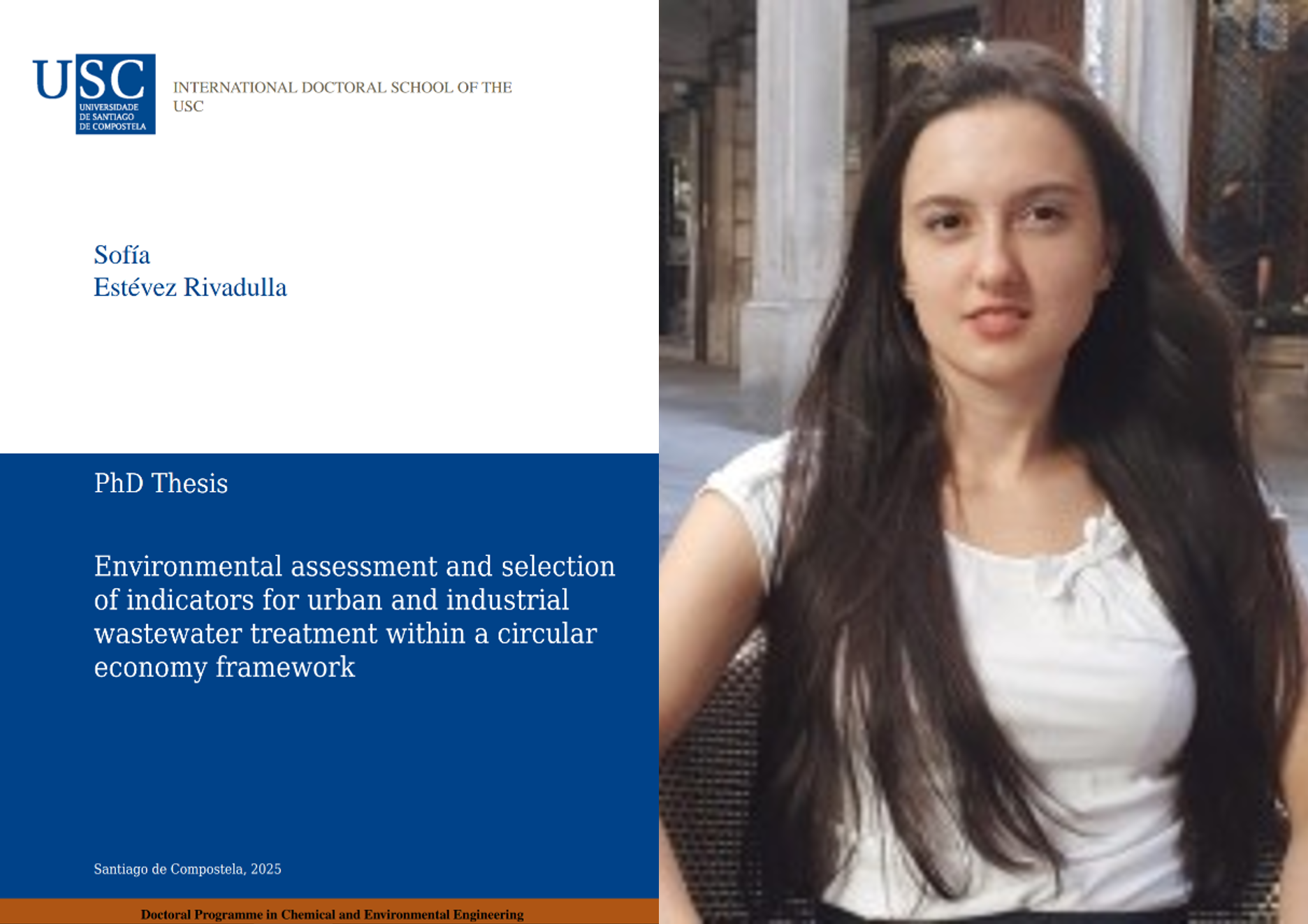 Please be informed that on Thursday, July 24 at 11:00 am, the semi-presential presentation and defense of Sofía Estévez Rivadulla's doctoral thesis, titled "Environmental assessment and selection of indicators for urban and industrial wastewater treatment within a circular economy framework" will take place in the auditorium of the School of Engineering. The thesis is supervised by Dr. María Teresa Moreira Vilar and Dr. Gumersindo Feijóo Costa.