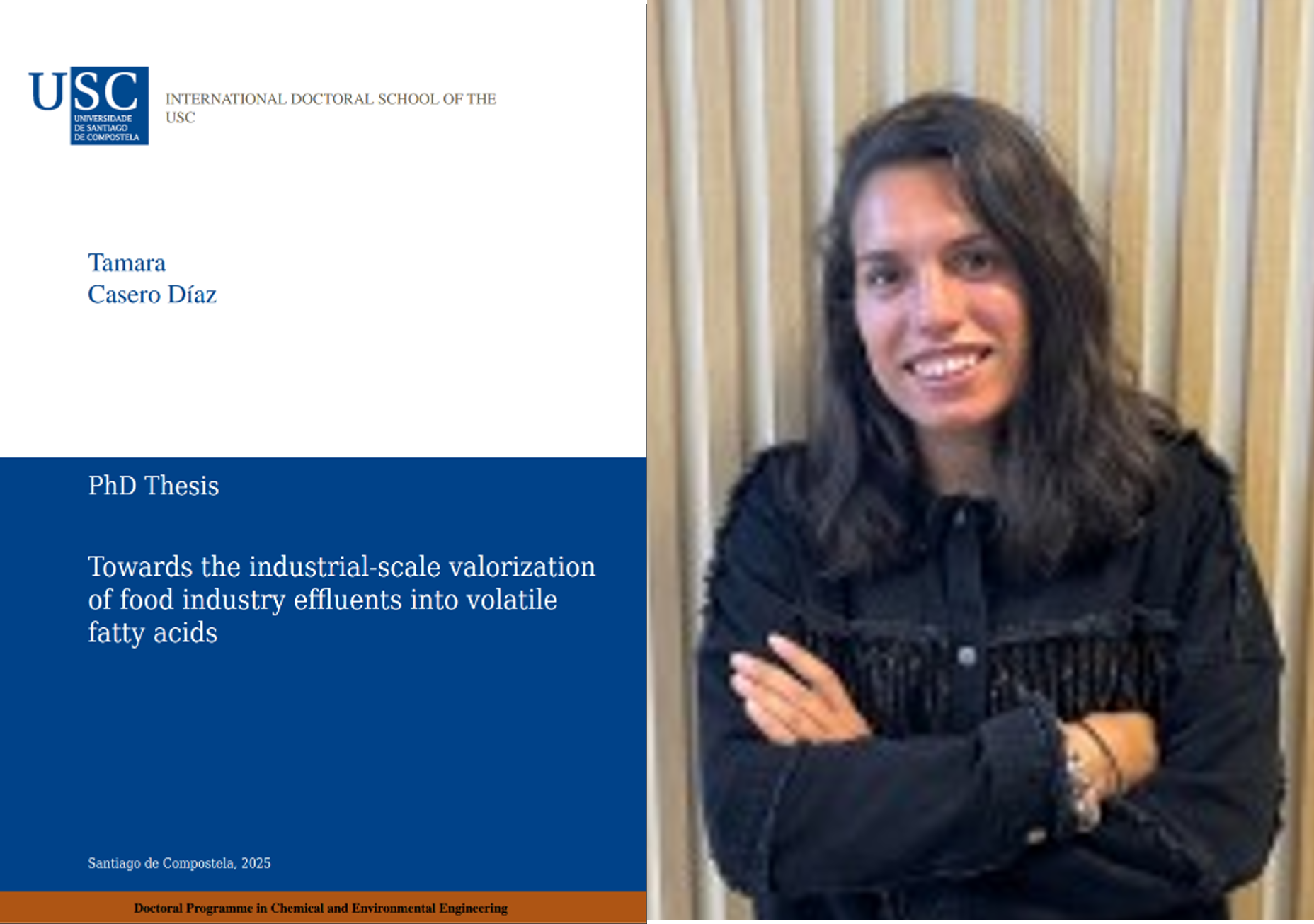 Please be informed that on Friday, October 10th at 10:30 AM, the presentation and defense of Tamara Casero Díaz's doctoral thesis, titled "Towards the industrial-scale valorization of food industry effluents into volatile fatty acids" will take place in the auditorium of the School of Engineering. The thesis is supervised by Dr. Miguel Mauricio Iglesias, Dr. Marta Carballa Arcos and Dr. Celia María Castro Barros.
