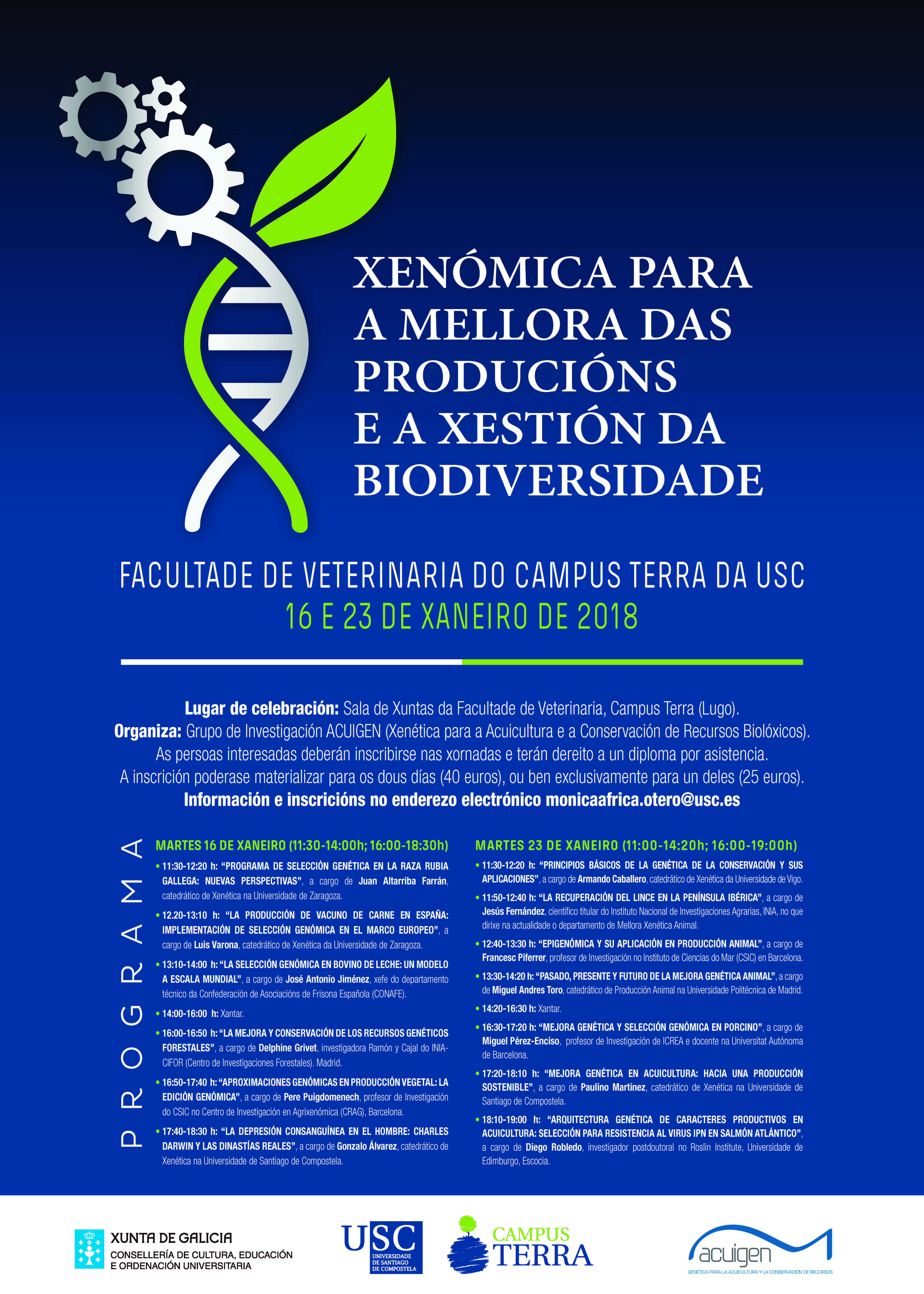 Las jornadas “Genómica para la mejora de las producciones y la gestión de la biodiversidad” que con el apoyo de Campus Terra organiza el grupo de investigación en genética ACUIGEN, van a suponer la oportunidad de escuchar, y discutir, con algunos de los expertos españoles más relevantes en materias como la mejora de la producción forestal, la conservación de la biodiversidad o la mejora genética en sectores clave para la economía gallega como son el sector del vacuno, el porcino o la acuicultura.