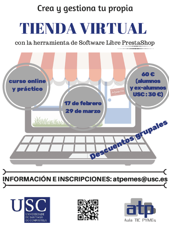 El aula TIC Pymes de la USC pone en marcha una nueva edición de su taller virtual de gestión de tiendas virtuales con Prestashop, un programa formativo on line estructurado en 50 horas lectivas que se desarrollará del 17 de febrero hasta el 29 de marzo de 2017.