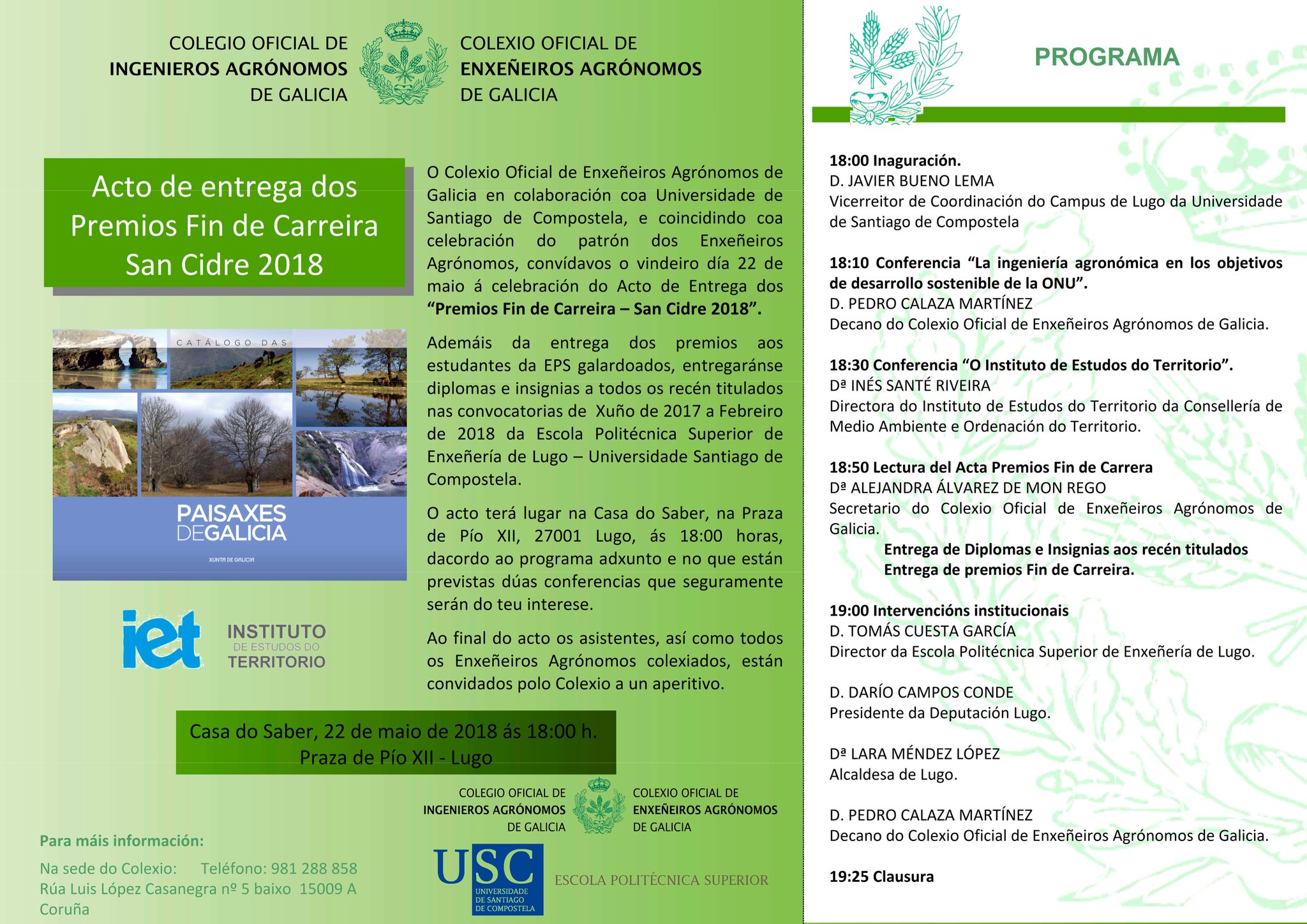 El Campus Terra de la USC y el Colegio Oficial de Ingenieros Agrónomos de Galicia celebran este martes 22 de mayo, a partir de las 18.00 horas, en el auditorio de la Casa do Saber de Lugo, el acto de entrega de los Premios de Fin de Carrera 2018, en el marco de una sesión en la que también se agasajará con diplomas e insignias a las personas que acaban de titularse en las convocatorias de junio de 2017 y febrero de 2018.