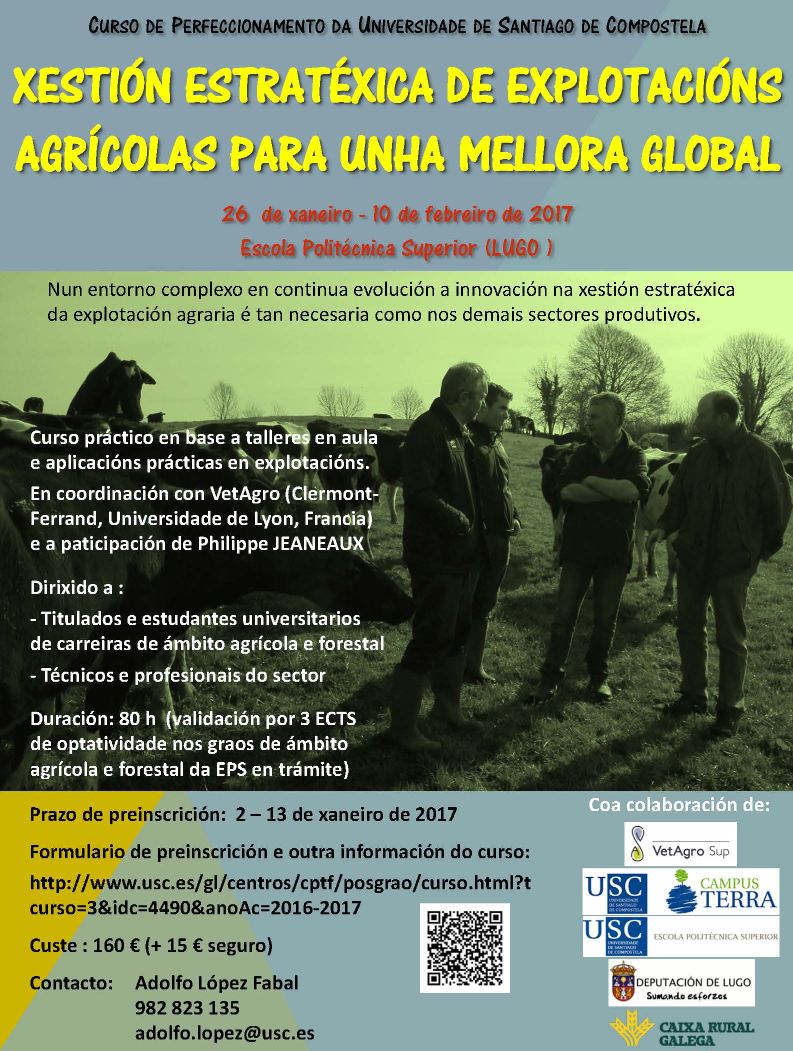 Para contribuir a una mejora en este campo, el Departamento de Producción Vegetal y Proyectos de Ingeniería de la USC y la escuela VetAgro Sup de la Universidad francesa de Lyon organizan el curso de perfeccionamiento Gestión estratégica de explotaciones agrícolas para una mejora global continua, que se va a desarrollar entre el 26 de enero y el 10 de febrero en la Escuela Politécnica Superior de Lugo con la colaboración del Campus Terra y de la Caja Rural Gallega. La preinscripción está abierta hasta este viernes 13.