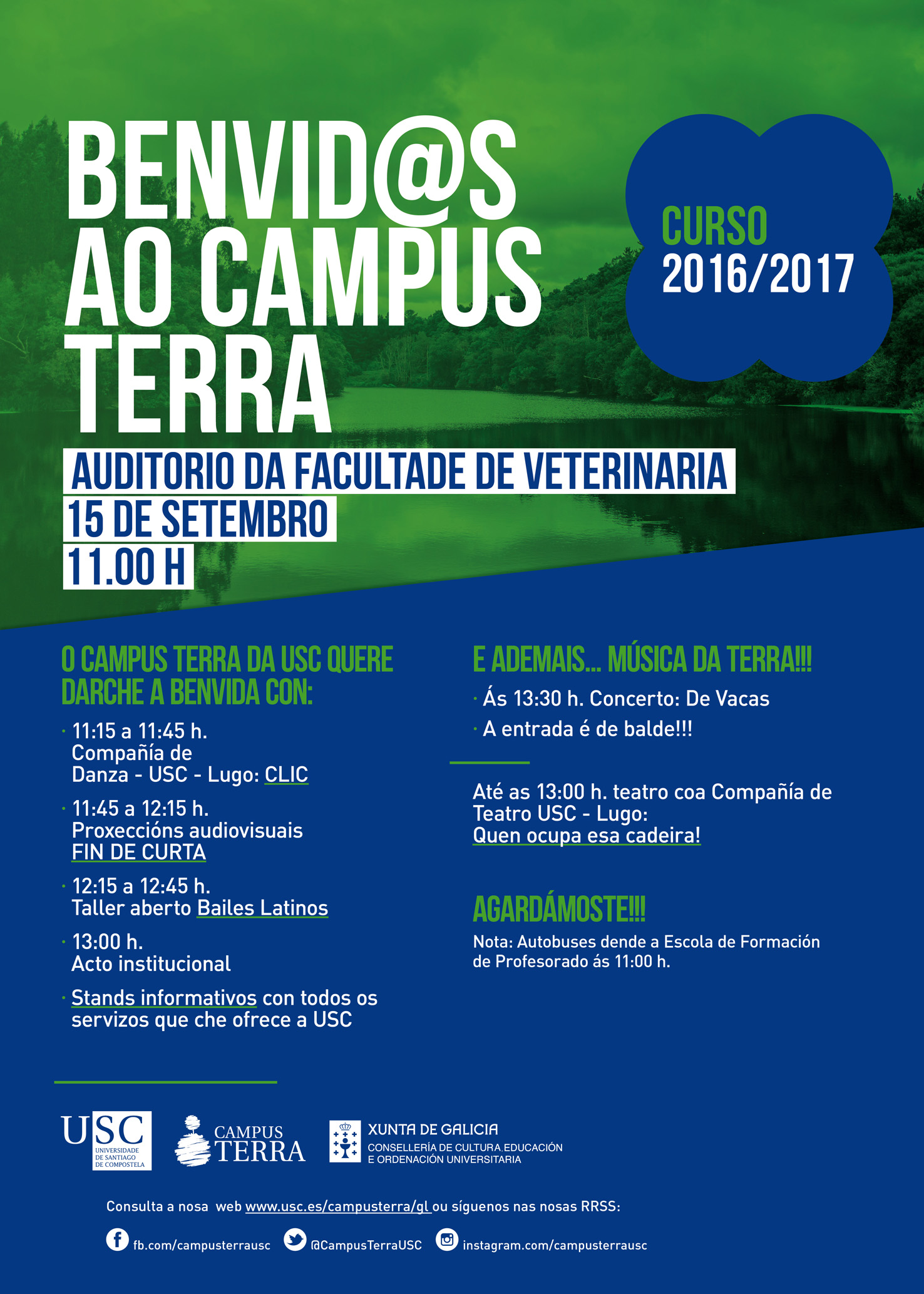El Auditorio de Veterinaria acoge este jueves 15, a partir de las 11:00 horas, la jornada 'Benvid@s ao Campus Terra', con la que desde el campus lugués se aspira a presentar ante el alumnado todas las prestaciones que ofrecen sus servicios. Así, adoptando la modalidad de una feria, los diferentes servicios contarán con sus respectivos stands desde los que distribuirán material informativo a los alumnos y alumnas del Campus Terra con la intención de explicar en qué consiste su actividad.