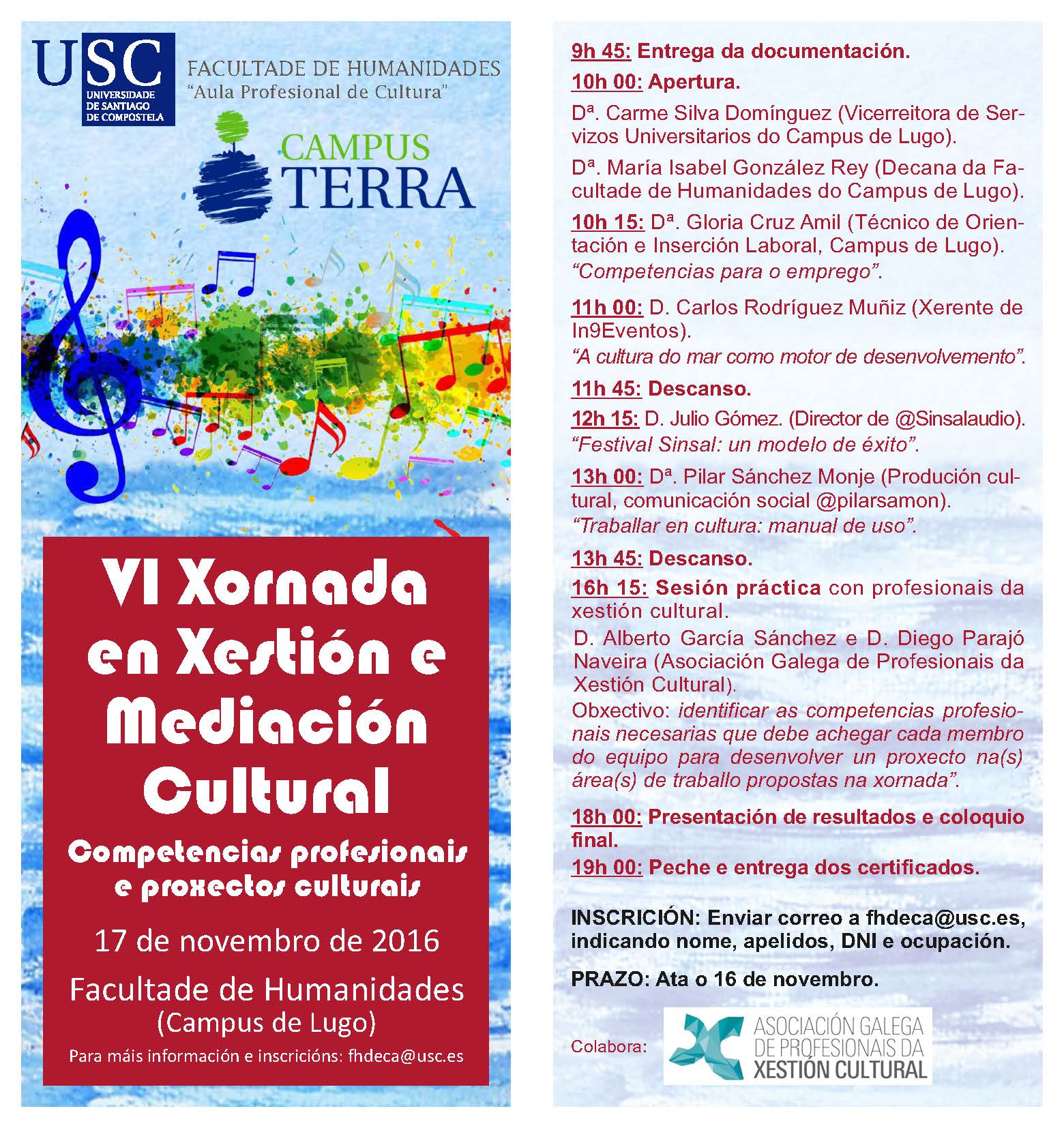 Las competencias profesionales de los gestores y mediadores culturales, así como su implicación en el desarrollo de proyectos en este campo, centrará la temática de la VI Jornada en Gestión y Mediación Cultural organizada por la Facultad de Humanidades del Campus Terra de la USC y que se desarrollará el próximo 17 de noviembre.