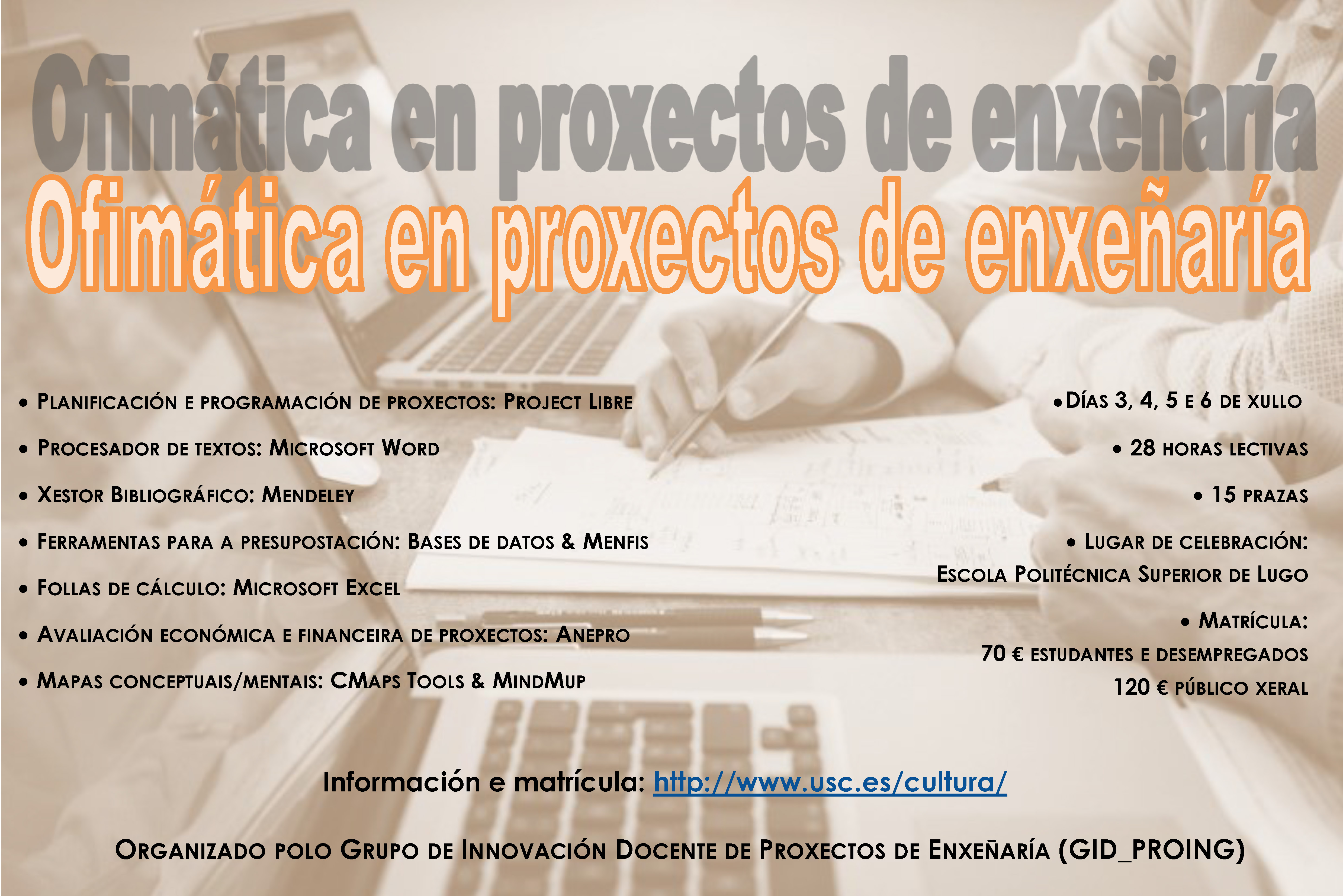 El curso incluye sesiones sobre planificación y programación de proyectos, herramientas para la presupostación, hojas de cálculo, procesadores de textos, gestores bibliográficos, así como programas para la evaluación económica, financiera y ambiental de proyectos. El alumnado podrá aprender a manejar, por ejemplo, Project Libre, diversas bases de datos, Microsoft Excel, Microsoft Word, Mendeley, Anepro, EIA09, CMaps Tools, MindMup, FreeMind y WBSTool.