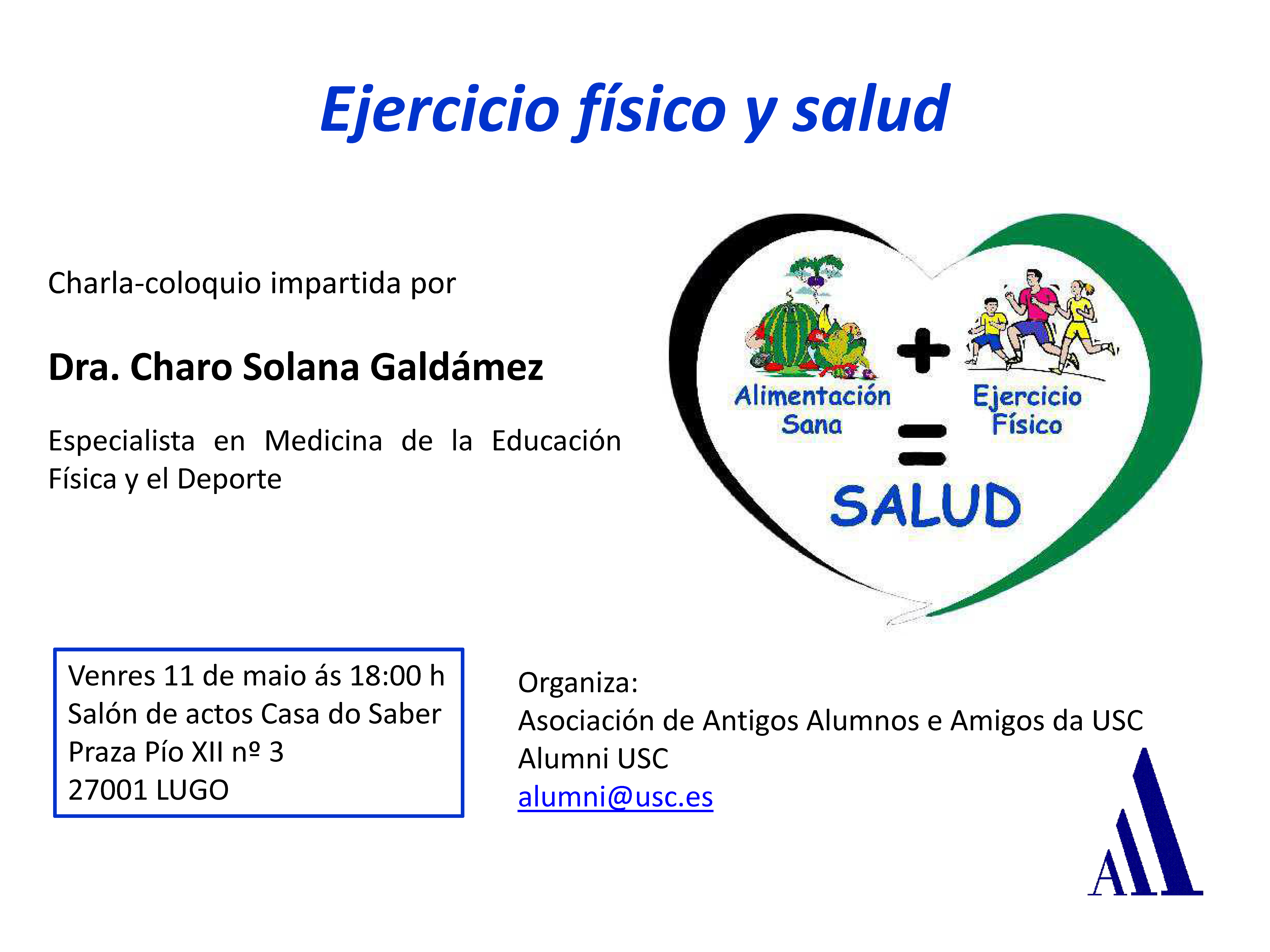La doctora Charo Solana Galdámez, especialista en Medicina de la Educación Física y el Deporte, imparte este viernes 11 de mayo, a partir de las 18:00h, en la Casa del Saber del Campus Terra, la charla-coloquio ‘Ejercicio físico y salud’, organizada por la Asociación de Antiguos Alumnos y Amigos de la Universidad de Santiago de Compostela Alumni USC.