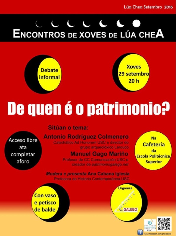 Los "Encontros de Xoves de Lúa Chea", un programa de debate sobre cuestiones de actualidad organizado por el colectivo universitario Proxéctate en Galego celebra este jueves 29 de septiembre, a partir de las 20.00 horas, un nuevo coloquio en la cafetería de la Escuela Politécnica Superior del Campus Terra de la USC.