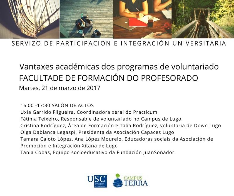 La Facultad de Formación del Profesorado del Campus Terra de la USC acoge este martes, a partir de las 16.00 horas, en el salón de actos del centro, una jornada sobre programas de voluntariado y ventajas académicas para el estudiantado universitario. Este foro, promovido por el Servicio de Participación e Integración Universitaria (Sepiu), a través de la oficina de Voluntariado del campus de Lugo, en colaboración con la profesora Uxía Garrido Filgueira, coordinadora general del Practicum en la Facultad de Formación del Profesorado, está orientado a estudiantes de primer curso del grado de Maestro/a en Educación primaria, aunque está abierta a la participación de todo el público interesado.