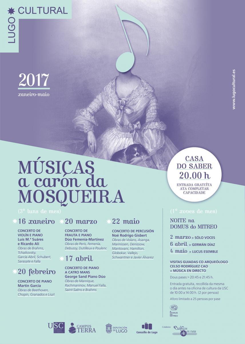 La programación de Lugo Cultural para 2017 arrancará el lunes 16 con el ciclo ‘Músicas a carón da Mosqueira’, iniciativa que impulsa a nuevos creadores e intérpretes dentro de la música clásica. A partir de las 20.00 horas en la Casa do Saber, la inauguración del ciclo le corresponderá el próximo día 16 a Luís Mª Suárez y Ricardo Alí, que interpretarán obras de Brahms, Tchaikovsky, García Abril, Schubert, Sarasate y Falla en un concierto de violín y piano de entrada libre hasta completar el aforo.