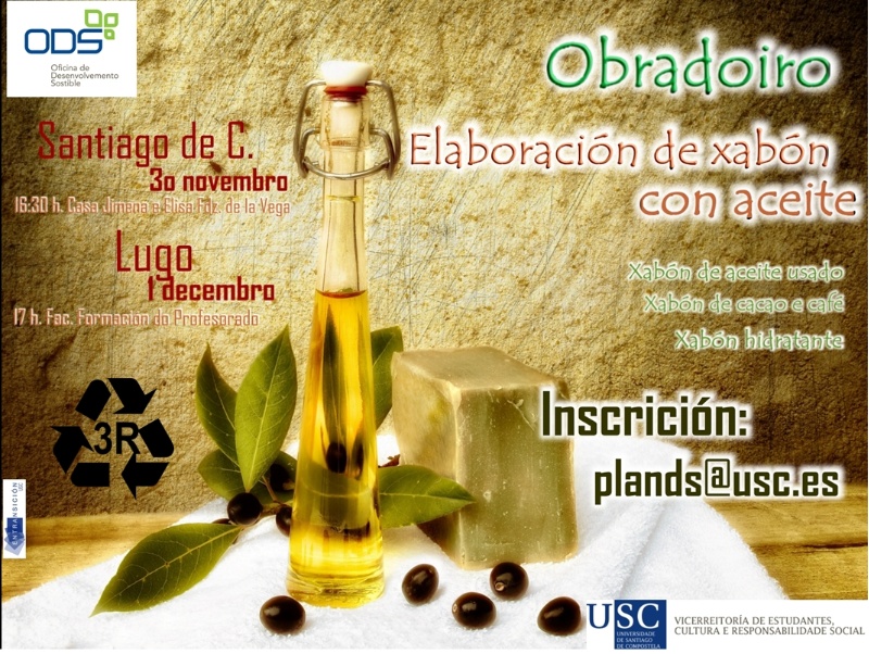 El jueves 1 de diciembre, en el Campus Terra de la USC, la Oficina de Desarrollo Sostenible organizará un taller de elaboración de jabón con aceite. El objetivo es aprender a reutilizar el aceite de cocina usado elaborando jabones artesanales para el cuidado de la higiene personal de tal modo que, además de generar un ahorro económico, se promueven conductas respetuosas con el ambiente. Según estudios ambientales, un litro de aceite usado que se descarta puede llegar a contaminar 1.000 litros de agua, ya que cuando entra en contacto con este elemento crea una capa fina que evita su oxigenación y causa la destrucción del ecosistema.
