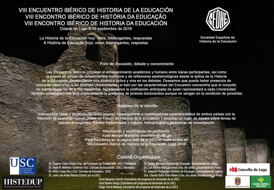 El VIII Encuentro Ibérico de Historia de la Educación citará en el Campus Terra de la USC a unos 60 investigadores de España y Portugal del 8 al 10 de septiembre de 2016. Esta reunión científica, organizada por la Sociedad Española de Historia de la Educación, se presenta como una ‘summer school’ que favorecerá el encuentro de jóvenes investigadores y doctorandos con algunos de los más prestigiosos especialistas de la península Ibérica con experiencia y trayectoria en este ámbito, según señala el profesor de la USC en la Facultad de Formación del Profesorado y presidente del comité organizador del congreso, Eugenio Otero Urtaza, que también es vicepresidente de la Sociedad Española de Historia de la Educación.