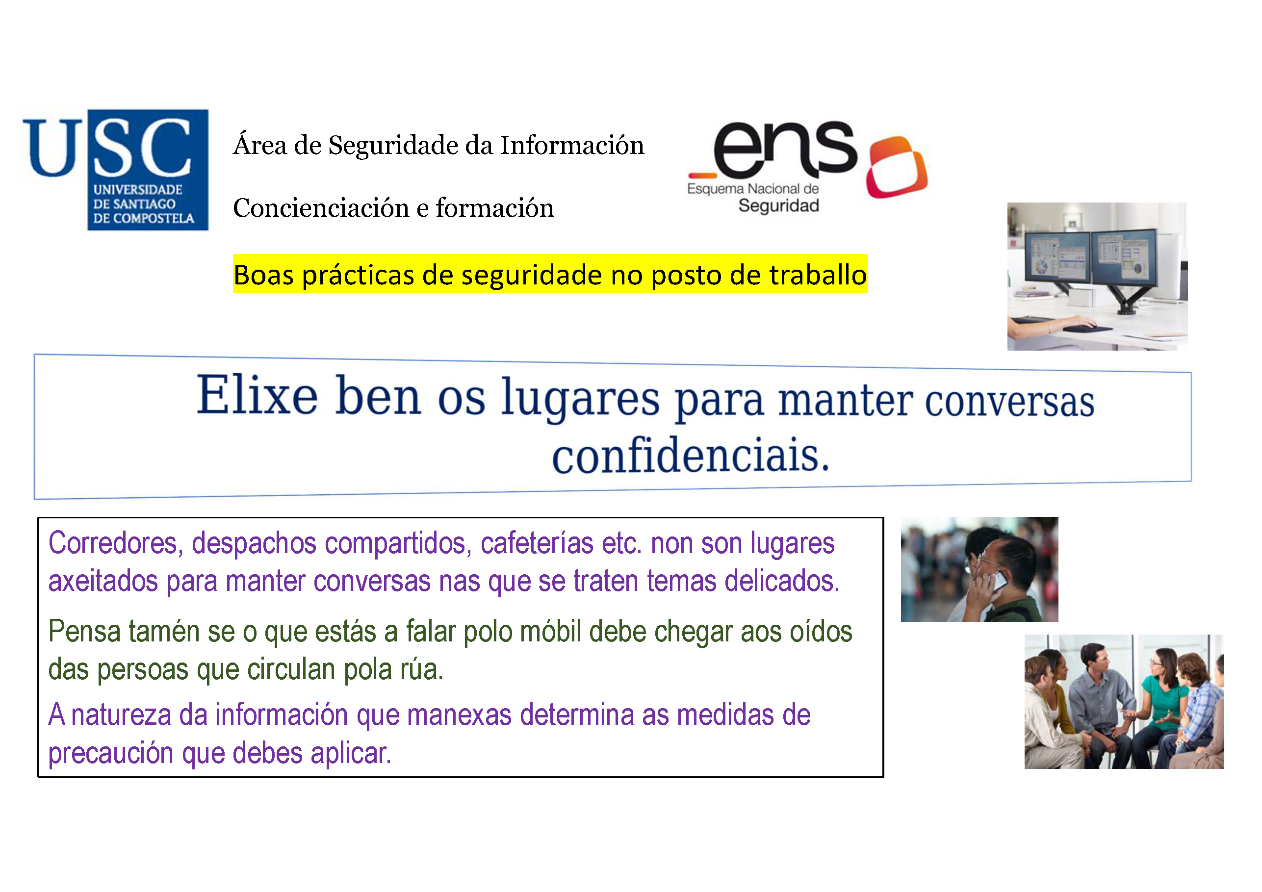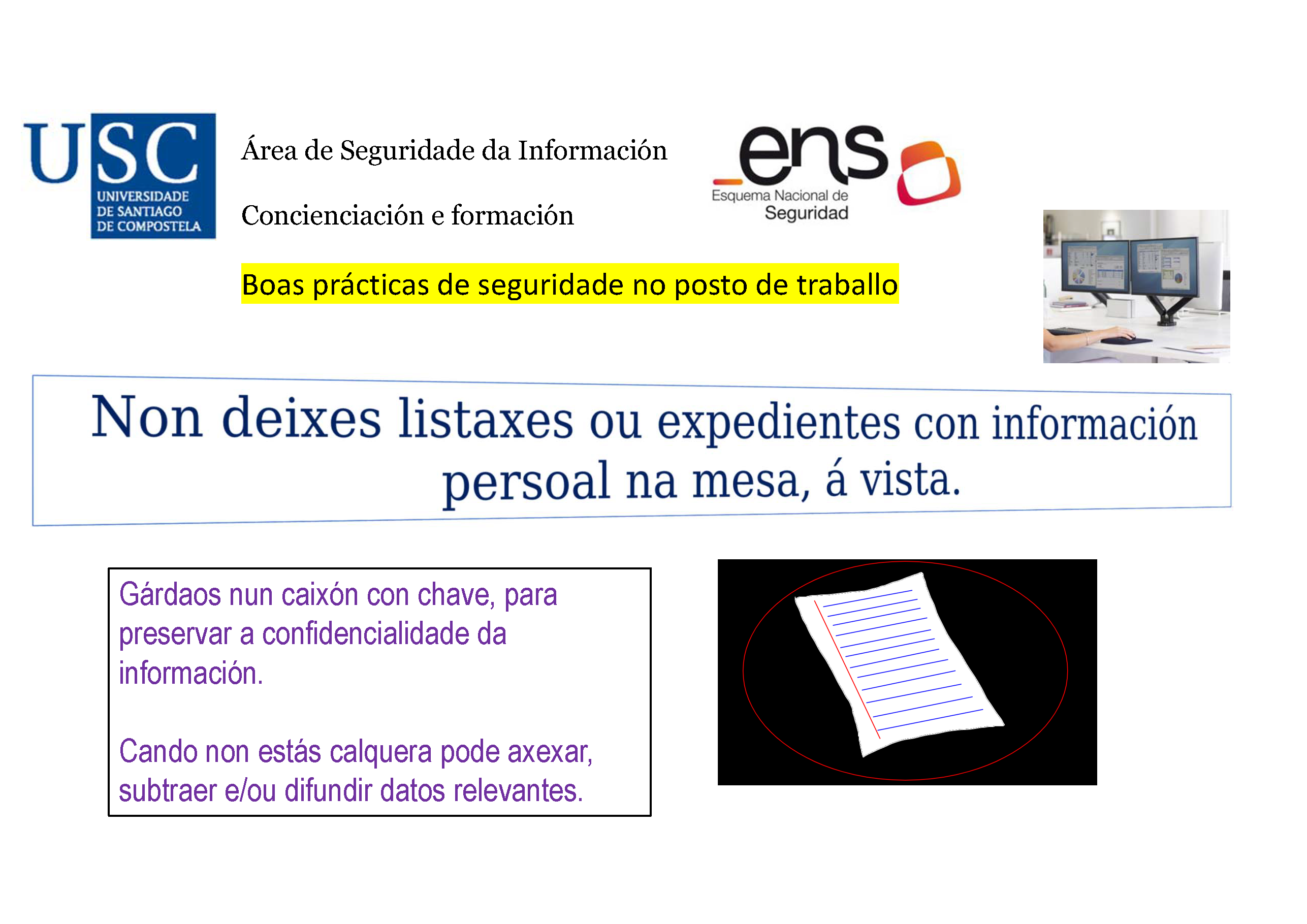 Estas prácticas son extremadamente perigosas. Debes bloquear o teu ordenador cando non esteas diante del; usa sempre o almacenamento na nube e garda baixo chave o que precises imprimir. Lembra que os lapis de memoria pérdense e a súa información pode caer en mans estrañas.