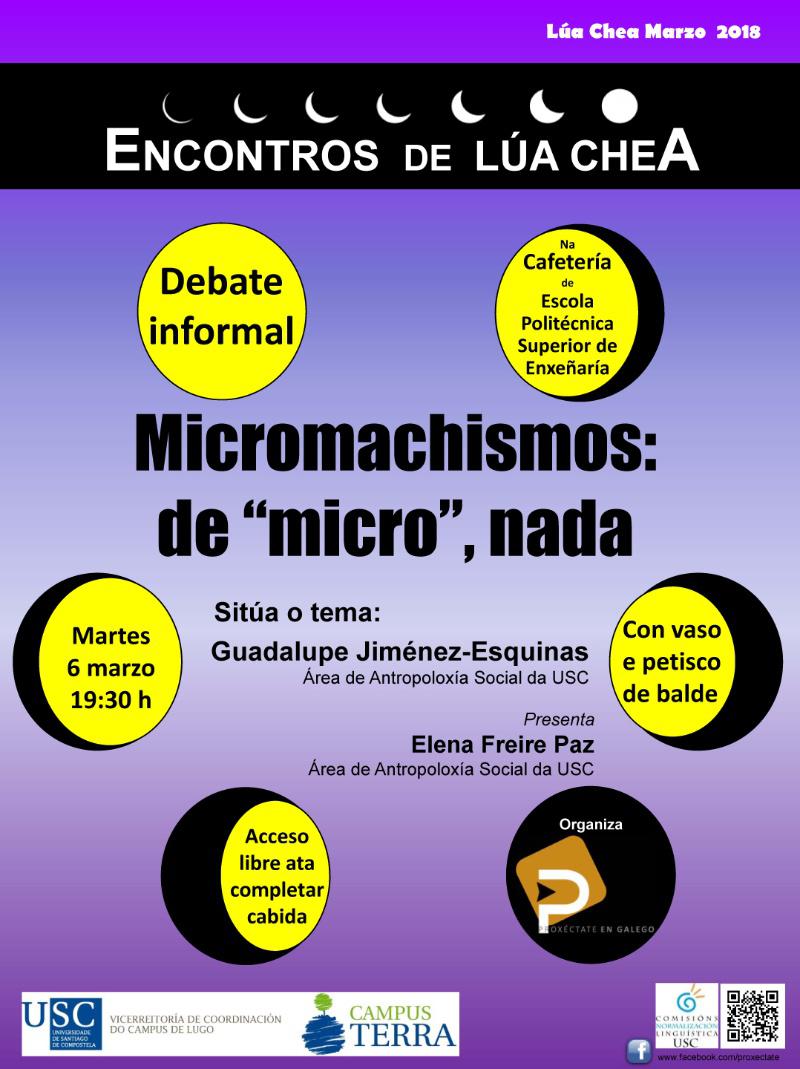 Os Encontros de Lúa Chea, un programa de encontros informais organizados polo colectivo Proxéctate en Galego para divulgar contidos académicos transversais de interese xeral ou de actualidade universitaria, tratarán este martes 6 de marzo, na cafetería da Escola Politécnica Superior do Campus Terra da USC a temática dos ‘micromachismos’.