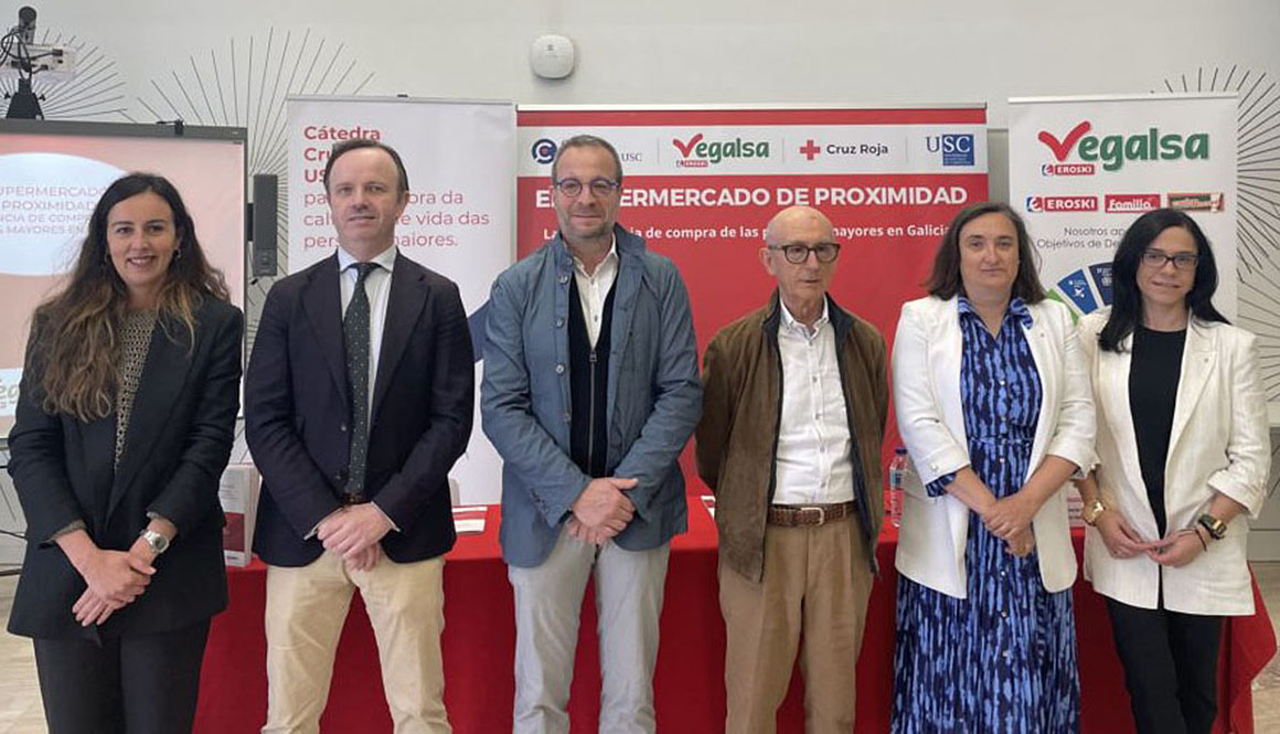 Tal e como explicaron Onésimo Juncos Rabadán, codirector da Cátedra Cruz Roja USC, e Trini de Lorenzo Otero, secretaria técnica da Cátedra Cruz Roja USC, o estudo achega conclusións moi interesantes que servirán para fomentar as boas prácticas do persoal do supermercado de proximidade na atención á clientela de maior idade, así como identificar posibles melloras. Na presentación estiveron tamén o director da Cátedra Cruz Roja USC, Arturo X. Pereiro Rozas; a directora de Responsabilidade Social Empresarial, Comunicación e Cliente de Vegalsa-Eroski, Gabriela González Márquez; a presidenta de Cruz Roja en Galicia, Mercedes Casanova Díaz; e o director xeral de Maiores e Atención Sociosanitaria da Xunta de Galicia, Antonio Acevedo Prado.