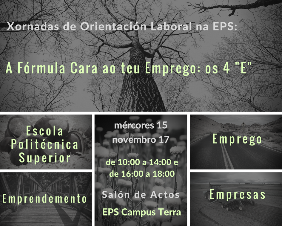O salón de actos da Escola Politécnica Superior de Enxeñaría acolle este mércores, a partir das 10.00h, a xornada de orientación laboral ‘A Fórmula Cara ao teu Emprego: os 4 "E"’, no que se fai referencia aos ‘E’ de EPS, Emprego, Emprendemento e Empresas.