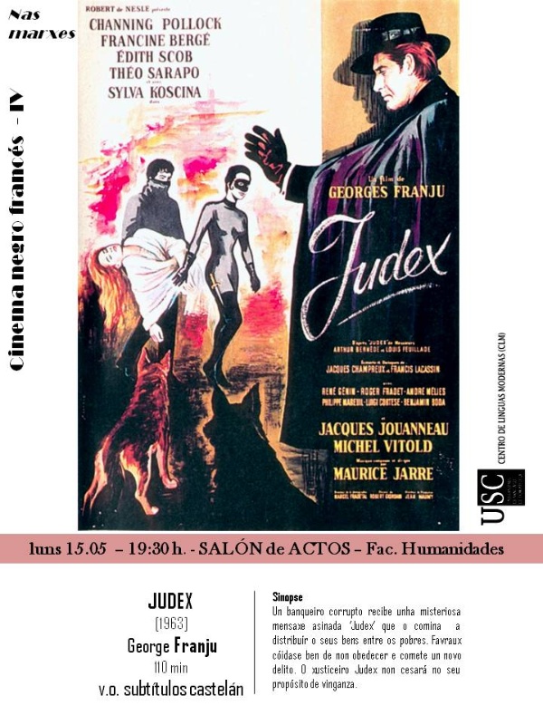 O ciclo de cinema negro francés, unha programación promovida pola sección de francés do Centro de Linguas Modernas no Campus Terra, continúa este luns 15 de maio no salón de actos da Facultade de Humanidades coa proxección de ‘Judex’, un filme dirixido en 1963 por Georges Franju, que poderá verse en versión orixinal con subtítulos en español.