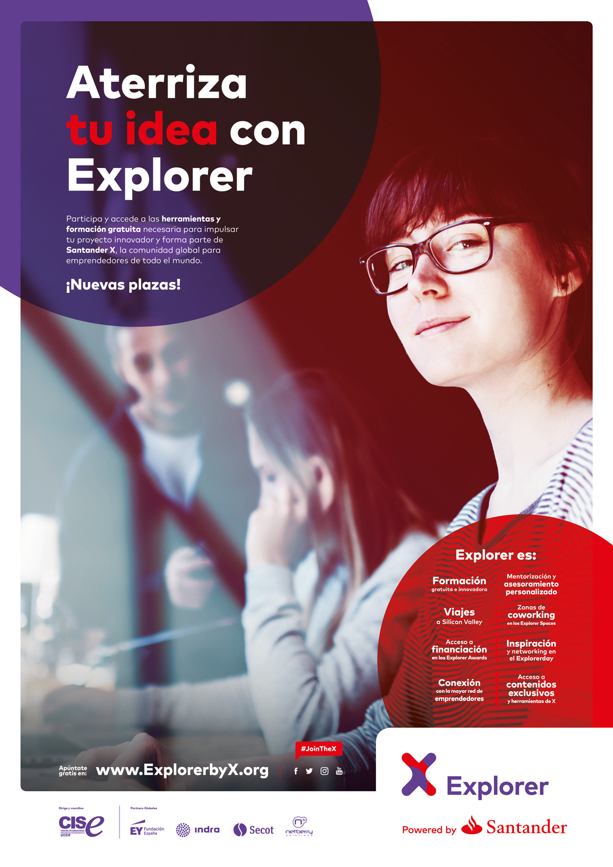 Ás vantaxes que tiveron miles de participantes nos programas de emprendemento impulsados polo Santander, Explorer suma a posibilidade de formar parte do maior ecosistema de emprendemento universitario do mundo a través da plataforma global Santander X, www.jointheX.org, que xa conta con mais de 40 universidades adheridas de distintos países, e convértese en punto de encontro de emprendedores, universidades e posibles socios e inversores de todo o mundo. Os participantes de Explorer poderán contactar con mozos do resto do mundo, gañar proxección internacional, xerar novas oportunidades para as súas startups nun entorno aberto, dixital e colaborativo, ademais de participar nunha iniciativa en rede que conta con máis de 150 institucións como a Fundación EY, Indra, Secot e Netberry.