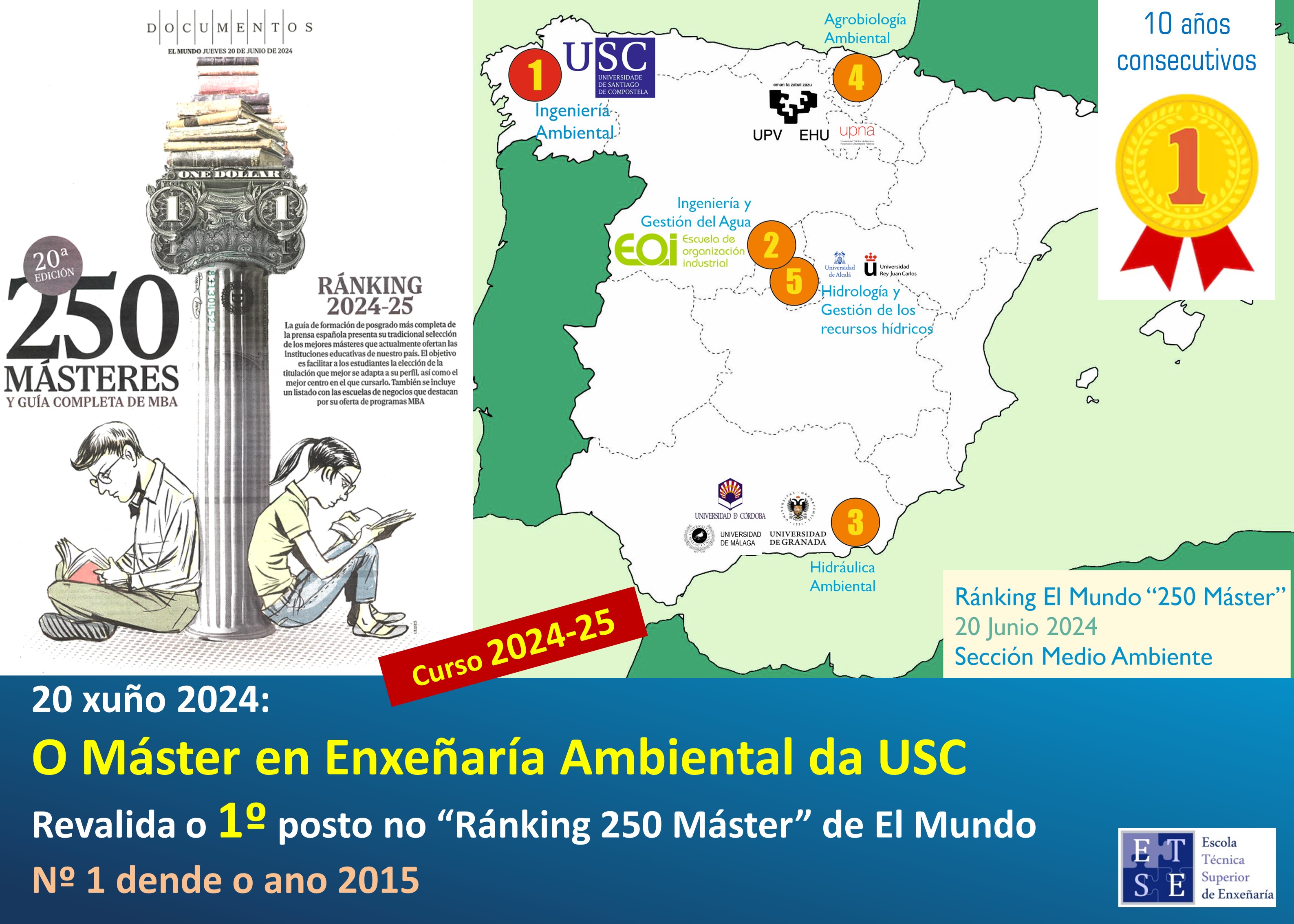 Hoxe, 20 de xuño de 2024, renovamos o liderado do Máster en Enxeñaría Ambiental da USC no Ránking 250 Máster que elabora anualmente o xornal El Mundo (sección Medio Ambiente).