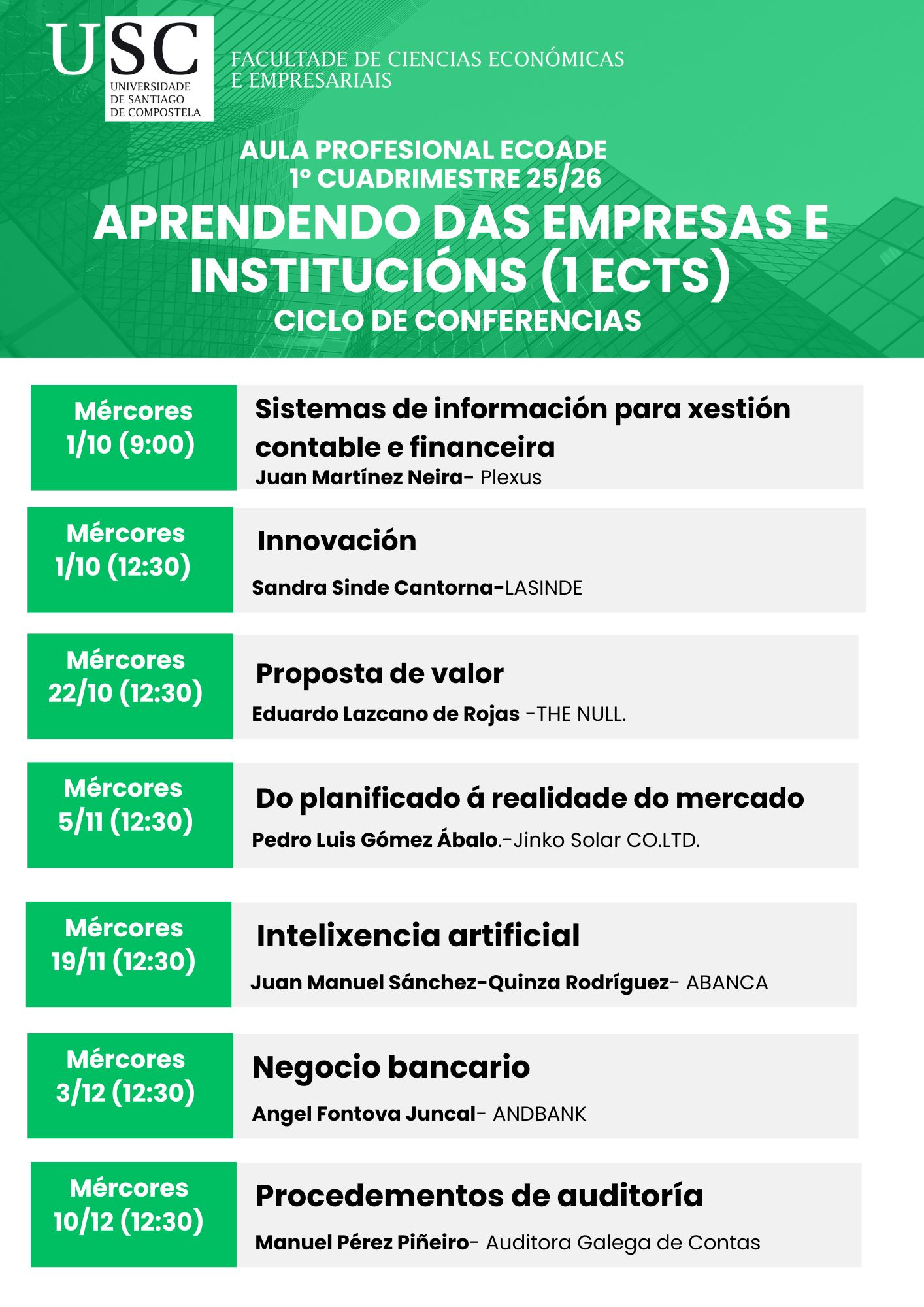- 9:00h: Sistemas de información para xestión contable e financeira. Juan Martínez Neira - Plexus