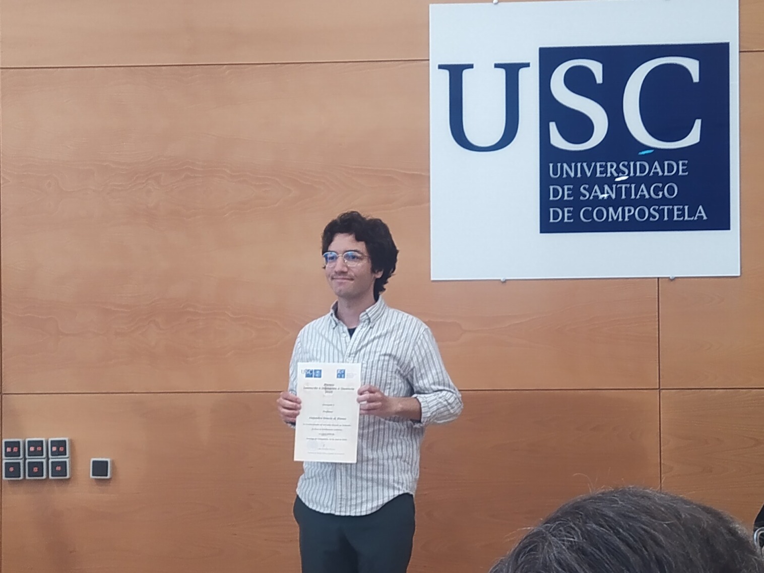 Durante acto de festividade da ETSE, que celebra o natalicio de Leonardo da Vinci o 15 de abril, entregáronse varios premios no que o noso departamento tivo representación. Alejandro Gracia di Rienzo, contratado predoutoral que está facendo a tese no noso departamento, recibiu o premio Leonardo pola súa calidade docente na materia de Lóxica no Grao en Intelixencia Artificial, na que leva participando dende hai dous cursos.