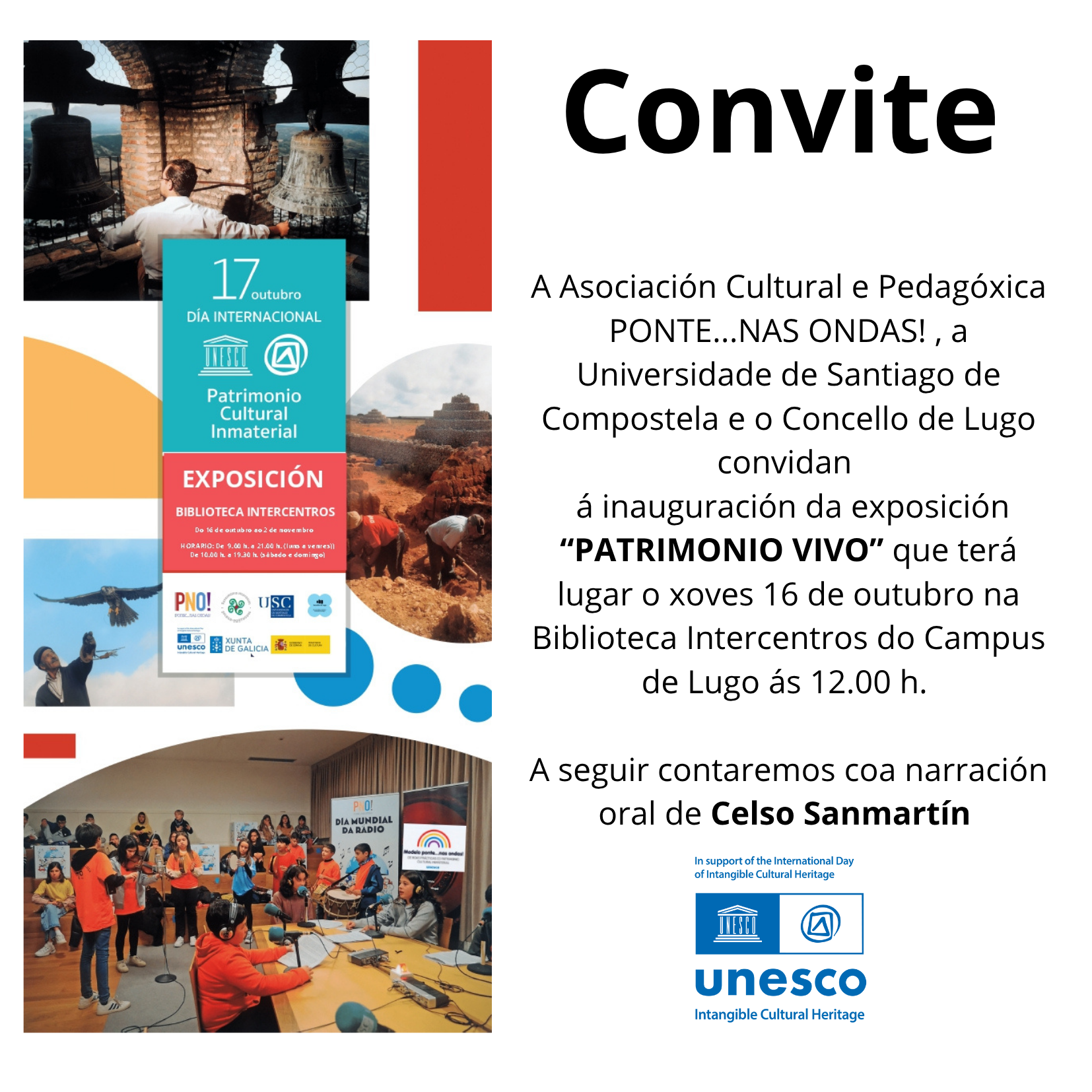 A Asociación Cultural e Pedagóxica Ponte...nas ondas!, única entidade galega acreditada pola UNESCO para o patrimonio cultural inmaterial, propón nesta segunda conmemoración reivindicar a riqueza e diversidade cultural do Estado cunha mostra fotográfica cos 25 bens patrimonio inmaterial recoñecidos pola Organización das Nacións Unidas para a Cultura, as Ciencias e a Educación.