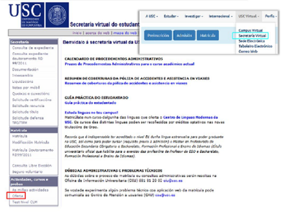O proceso de matrícula realízase desde a Secretaría Virtual. Unha vez dentro, debes ir ao apartado Actividades, Cursos e Probas e picar en Oferta.