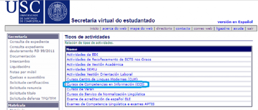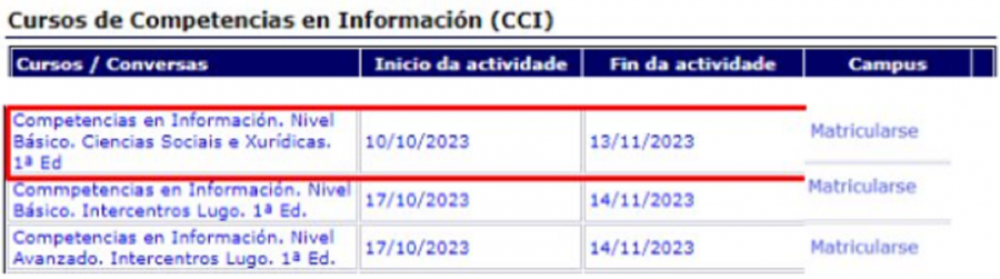 O seguinte paso será seleccionar entre a oferta dispoñible, os Cursos de Competencias en Información (CCI).