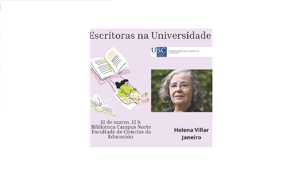 O vindeiro mércores 12 de marzo iníciase o ciclo "Escritoras na Universidade", coa visita de Helena Villar Janeiro á biblioteca da Facultade de Ciencias da Educación (Campus Norte). Esta será a primeira dunha serie de encontros con escritoras que se achegarán a biblioteca para compartir as súas experiencias no mundo da literatura e reflexionar sobre o espazo das bibliotecas como lugares de aprendizaxe. O encontro comezará ás 12 horas.