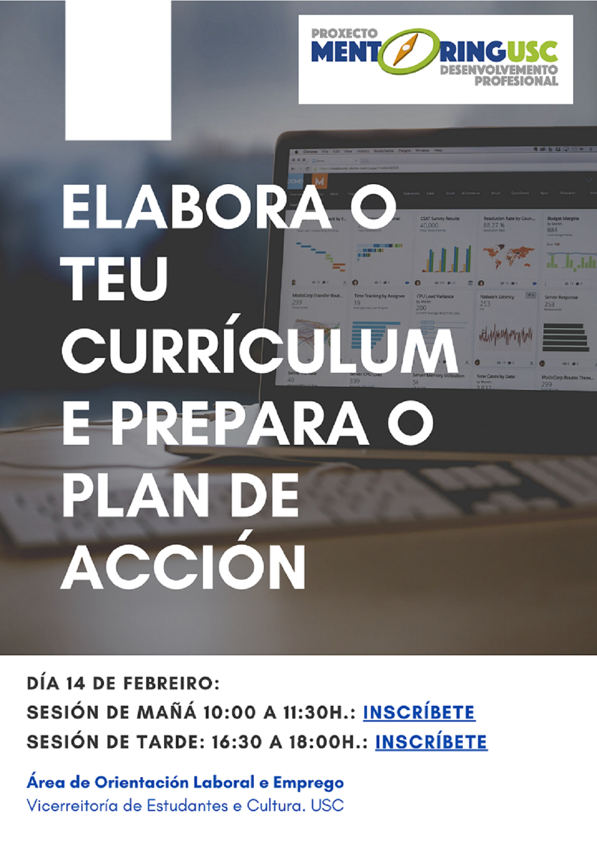 O persoal da Área de Orientación Laboral organiza e imparte esta actividade dirixida ao alumnado participante no Proxecto Mentoring USC. A formación ten como obxectivo ofrecer pautas para a realización dun CV  eficaz e a preparación do plan de acción para traballar posteriormente cos/as mentores/as.
