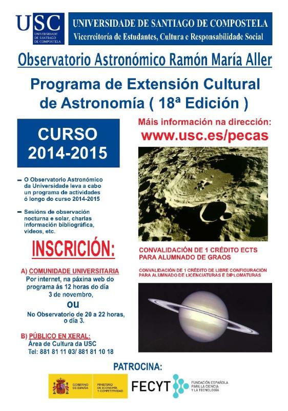 O Observatorio Astronómico Ramón María Aller organiza este curso a décimo oitava edición do Programa de Extensión Cultural de AStronomía (PECAS), dirixido tanto a Comunidade Universitaria como a sociedade en xeral. A súa finalidade é achegar o mundo da Astronomía especialmente ao alumnado que non ten un contacto curricular con esta rama da ciencia, ao tempo que abrir as instalacións do Observatorio a todas as persoas que o desexe, que así poderán terán a oportunidade de realizar observacións a través dos telescopios e recibir ensinanzas teóricas e prácticas de Astronomía a un nivel asequible. Os integrantes da comunidade universitaria interesados en participar das actividades deste programa de extensión cultural deberán formalizar a matrícula o próximo luns 3 de novembro. Toda a información sobre o desenvolvemento de PECAS está dispoñible na web do observatorio. Esta iniciativa conta co apoio da Vicerreitoría de Estudantes, Cultura e Responsabilidade Social e da Fundación Española para la Ciencia y la Tecnología (FECYT).