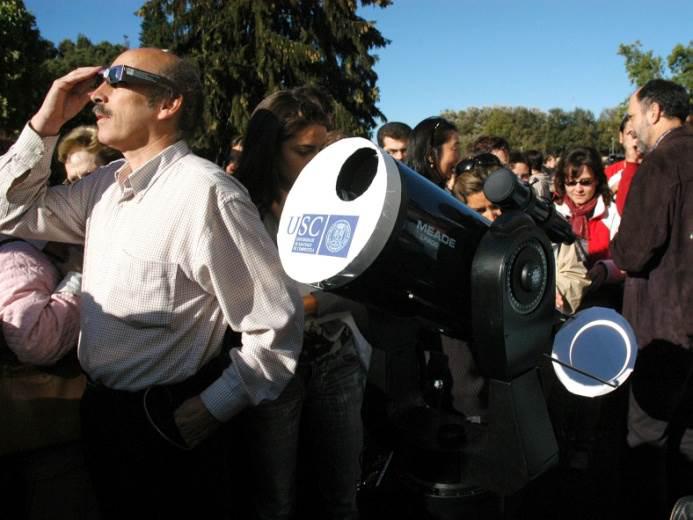As especiais precaucións que se deben tomar para observar a eclipse total de sol deste venres motivan que o Observatorio Astronómico Ramón María Aller da USC organice nos xardíns das súas instalacións, no Campus Vida de Santiago, unha sesión pública de seguimento de todo o fenómeno, entre as 9:05 e as 11:18 horas. O mesmo acontecerá en Sanxenxo e Padrón, vila esta última onde ademais o director do Observatorio José Ángel Docobo explicará o fenómeno este xoves 19 no Auditorio ás 20.00 horas. Dado que a eclipse se inicia no Atlántico e pasa entre Islandia e as Illas Británicas para rematar no Polo Norte, será a galega a comunidade onde a Lúa oculte máis o Sol; concretamente na costa noroeste chegará a ocultarse máis dun 75% da superficie solar. O seu máximo darase en Galicia ás 10:09 horas. O procedemento máis seguro para observala é proxectar sobre unha superficie a imaxe producida por un pequeno telescopio, pero nunca mirar directamente o Sol e menos aínda observalo con prismáticos ou telescopios. Unha alternativa, se non se dispón das gafas especiais ao efecto, pode ser usar os cristais que se adoitan utilizar en soldadura “pero neste caso débense manexar con máximo factor de protección e non mirar de xeito continuado”, advirte Docobo, que subraia “en todo caso, os máis cativos deben de estar sempre tutelados”. Quen non conte cos medios axeitados ou non poida participar nas observacións dirixidas por expertos poderá seguir a eclipse vía internet polo Real Instituto y Observatorio de la Armada (ROA, http://www.eclipse.roa.es/), por Canal Ciencia (http://www.sky-live.tv/index-canal-ciencia.html) e por Misión Eclipse (http://www.misioneclipse.es/). A máis importante dende 2005 A eclipse do venres vai ser a máis importante en Galicia dende aquela espectacular anelar do 3 de outubro de 2005. Entón, aínda que a Lúa se situou xusto fronte ao Sol non o tapou completamente deixando un aro de luz solar arredor do satélite. Iso debeuse a que a Lúa estaba preto do apoxeo –m áxima distancia a nós, tendo en conta que a distancia entre a Lúa e a Terra oscila entre 356.375 e 406.720 quilómetros–.