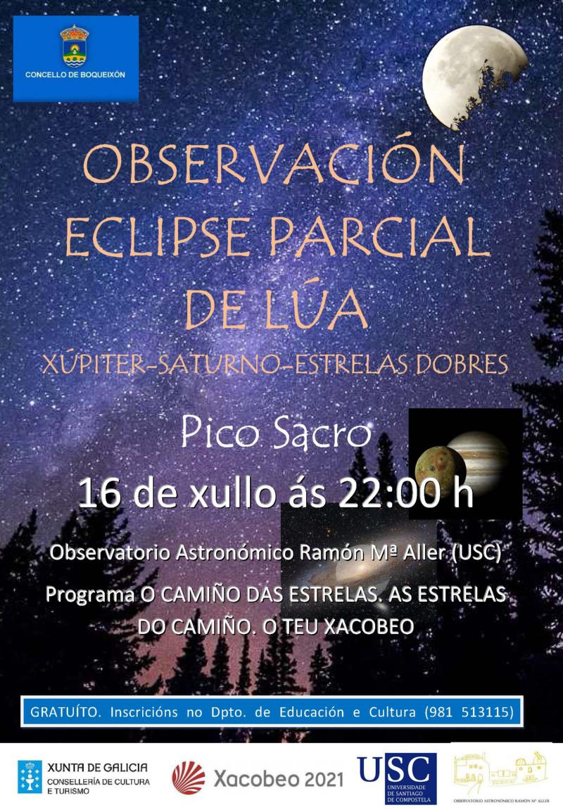 O programa de actividades comezará o vindeiro martes 16 no Pico Sacro, onde ás 22.00 horas o concello de Boqueixón convoca unha sesión de observación da eclipse parcial de Lúa, que se iniciará coincidindo coa saída do satélite polo leste-surleste. Como explica o director do Observatorio Astronómico, José Ángel Docobo, as 23.30 terá lugar o máximo da eclipse, momento no cal a Terra tapará mais da metade do disco lunar. O fenómeno vaise prolongar ata a 1.00 horas do día 17. Paralelamente ao seguimento da eclipse, poderanse observar a través do telescopio o planeta Xúpiter e unha estrela dobre entre outros obxectos.