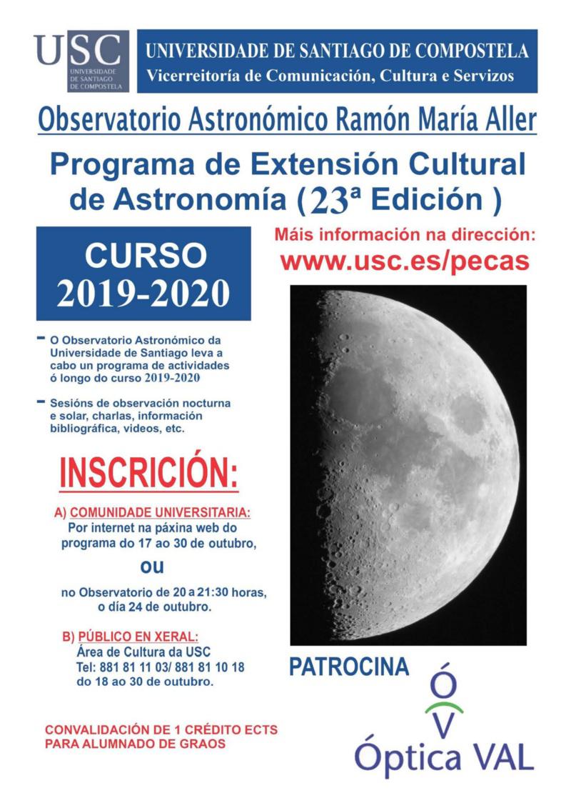 O Observatorio Astronómico Ramón María Aller da USC mantén aberto ata o vindeiro 30 de outubro o prazo de inscrición para o seu Programa de Extensión Cultural de Astronomía (Pecas), que chega xa á súa vixésimo terceira edición. O propósito do curso, dirixido aos membros da comunidade universitaria e ao público xeral, é dar a coñecer o mundo da Astronomía, así como as funcións do Observatorio, fundamentalmente a aquelas persoas que non teñen un contacto directo coa ensinanza oficial desta disciplina.