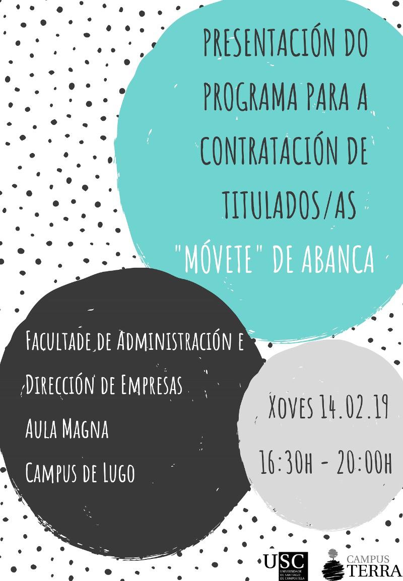 A Facultade de Administración e Dirección de Empresas (ADE) do campus de Lugo acollerá este xoves, a partir das 16.30 horas, a presentación do programa ‘Móvete’, unha iniciativa a través da que Abanca busca titulados e tituladas en Administración e Dirección de Empresas, Relacións Laborais e Recursos Humanos e Dereito para incorporar á rede de oficinas de que dispón a entidade financeira na provincia de Lugo.