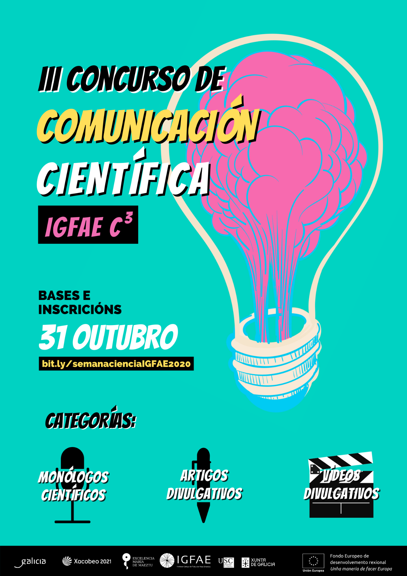 O Instituto Galego de Física de Altas Enerxías (IGFAE) convoca a terceira edición do Concurso de Comunicación Científica (IGFAE C3), que ten como obxectivo fomentar o interese pola cultura científica e estimular a aprendizaxe da Física e os seus fundamentos. Dividido en tres categorías que pretenden desenvolver diferentes habilidades comunicativas e utilizando ferramentas virtuais e Internet, o concurso está aberto a persoas de calquera país. O período de inscrición acaba o 1 de novembro ás 23:59 horas.