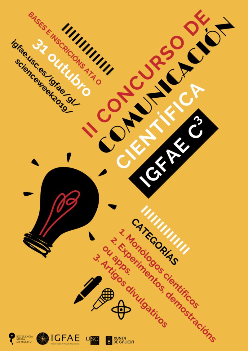 A segunda edición do Concurso de Comunicación Científica (C 3) bota a andar coa pretensión de promover a cultura científica da cidadanía e, en particular, fomentar o interese pola Física, estimulando a aprendizaxe dos seus fundamentos. Esta é unha acción promovida polo Instituto Galego de Física de Altas Enerxías (IGFAE) no marco da Semana da Ciencia que se vai celebrar na parte final do ano.