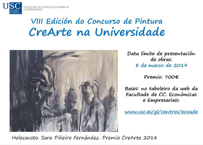 A Facultade de Ciencias Económicas e Empresariais convoca de novo o concurso de pintura CreArte na Universidade, que mantén aberto ata o 8 de marzo o prazo para presentar traballos. O certame, que este ano chega á súa oitava edición, está aberto á participación non só da comunidade universitaria senón tamén da sociedade en xeral. A dotación do premio é de 700 euros.