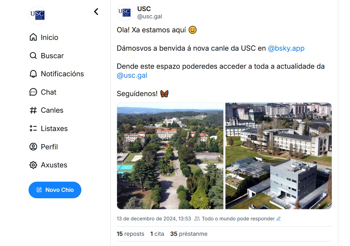 Deste xeito, a Universidade de Santiago iniciou a creación de contido na plataforma social Bluesky, onde conta cun perfil oficial verificado dende este mes de decembro. A USC recomenda que todas aquelas contas institucionais que estaban a crear contido en X procedan a crear un perfil en Bluesky para continuar a difundir os seus contidos. A recomendación á hora de crear perfís de tipo institucional é a de empregar o seu nome propio pegado ás siglas USC.