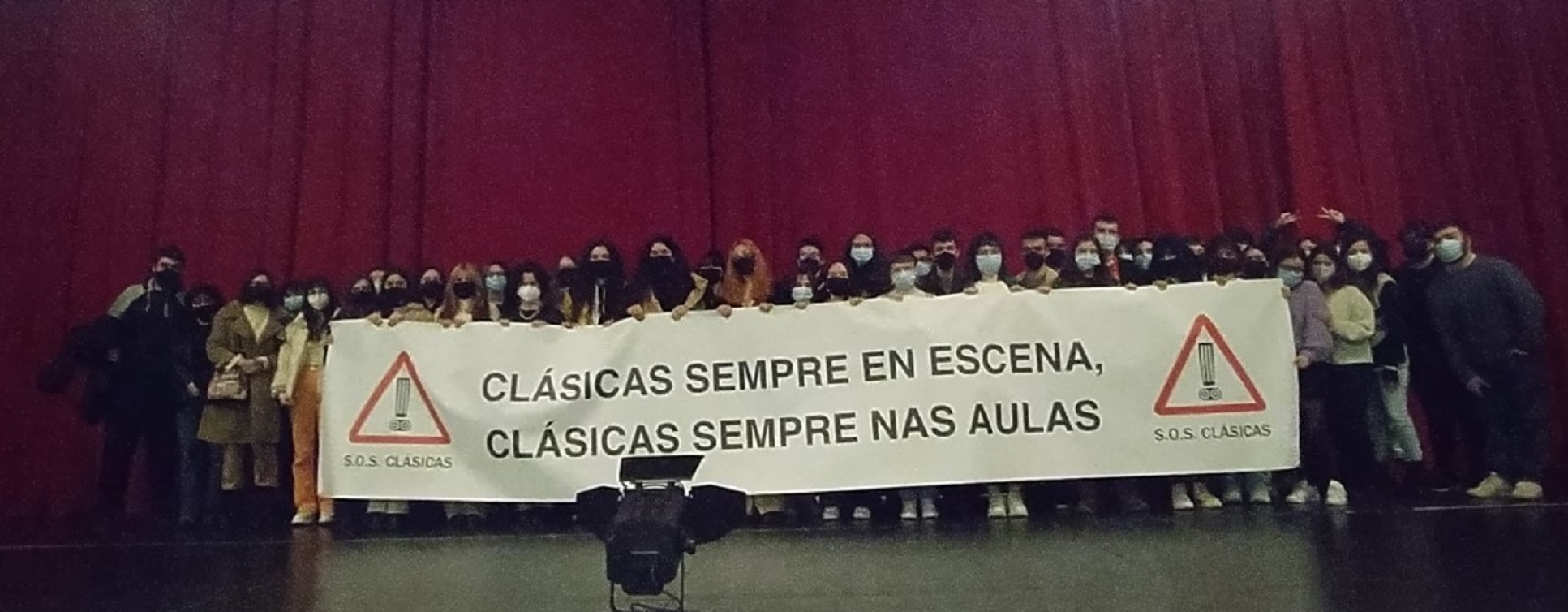 O alumnado da USC presente neste festival de teatro clásico tivo a oportunidade de gozar da interpretación da traxedia de Eurípides ‘Ifixenia en Áulide’, así como da comedia ‘O Persa’, de Plauto. Unha vez rematadas as representacións teatrais, o estudantado da USC subiu ao escenario cunha pancarta na que se podía ler a mensaxe ‘Clásicas sempre en escena, clásicas sempre nas aulas’, a fin de reivindicar a presenza das materias clásicas no ensino secundario, “por formar parte da nosa herdanza cultural e ser o fundamento do nosa esencia europea”.
