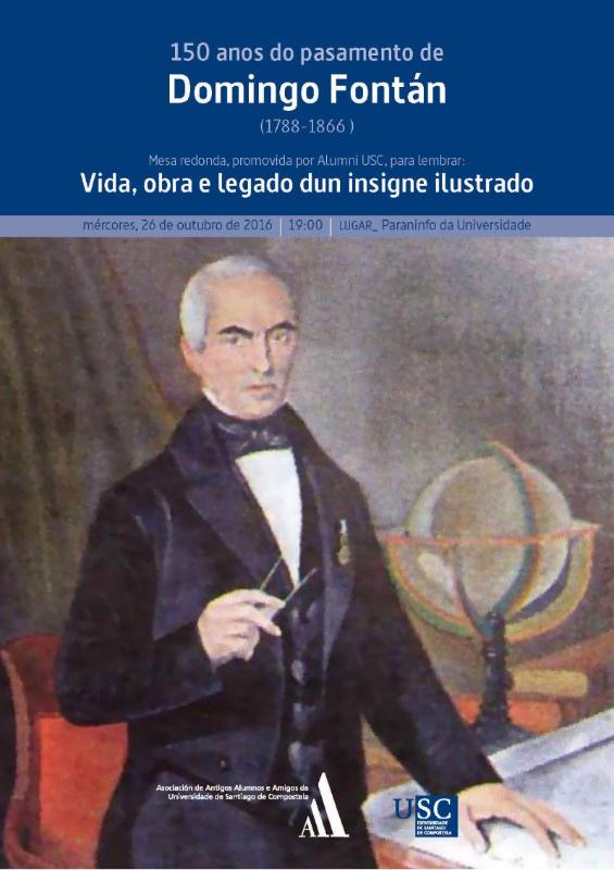 A asociación Alumni USC organiza este mércores 26 unha mesa redonda na que se fará un percorrido pola vida, obra e legado do insigne xeógrafo Domingo Fontán (1788-1866) cando se cumpren 150 anos do seu pasamento.