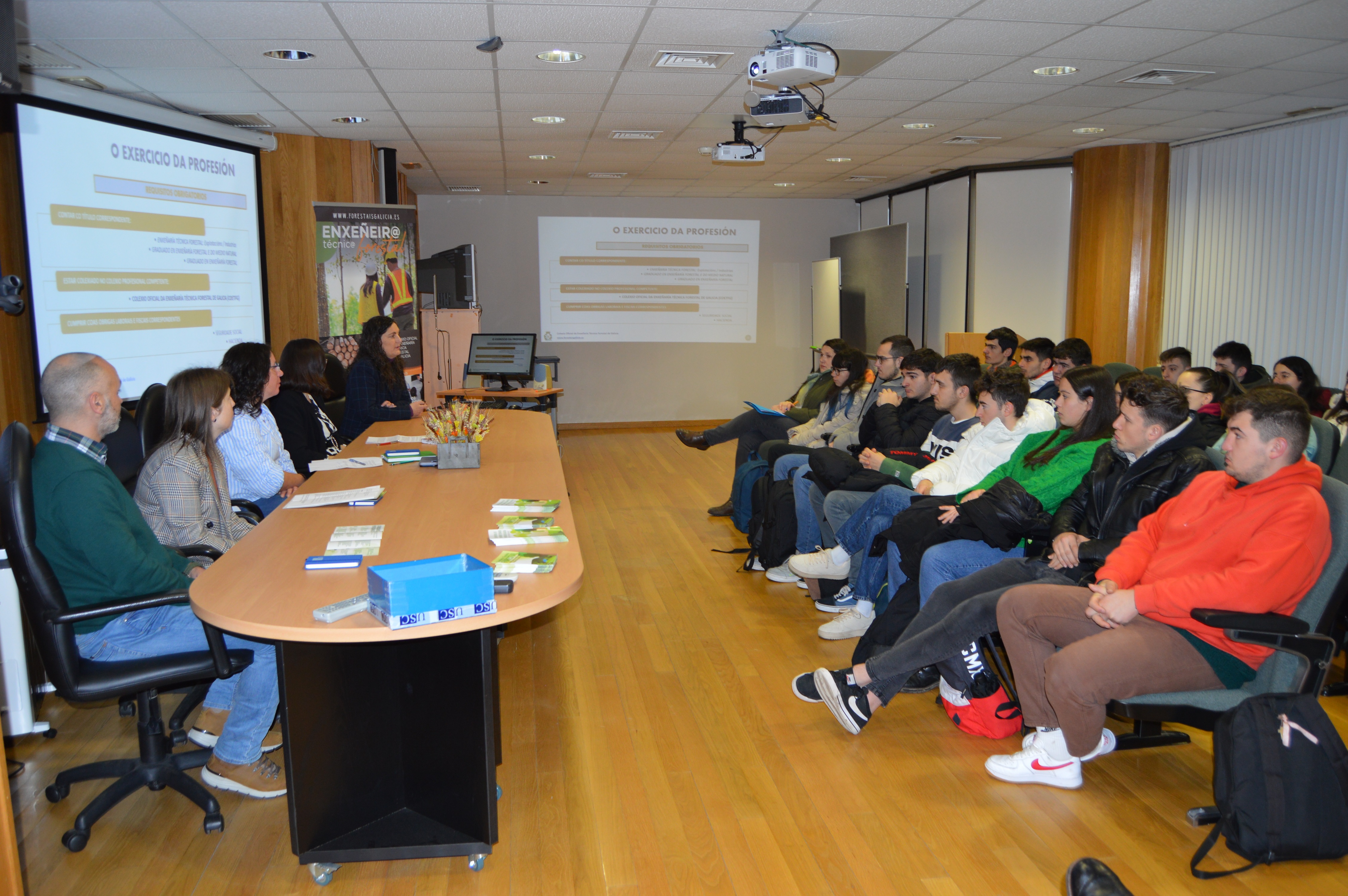 O amplo e versátil horizonte laboral ao que abre as portas o grao en Enxeñaría Forestal centrou este luns unha xornada na Escola Politécnica Superior de Enxeñaría do Campus Terra da USC no marco da que a xerente do Colexio Oficial de Enxeñaría Técnica Forestal de Galicia (COETFG), Patricia González Pereiró, acompañada de varios profesionais en exercicio colexiados, explicaron ao alumnado do centro universitario lugués, as múltiples oportunidades de emprego que ofrece na actualidade unha profesión regulada, na que “a demanda de profesionais é moi superior ao número de persoas tituladas que se incorporan ao mercado de traballo”.