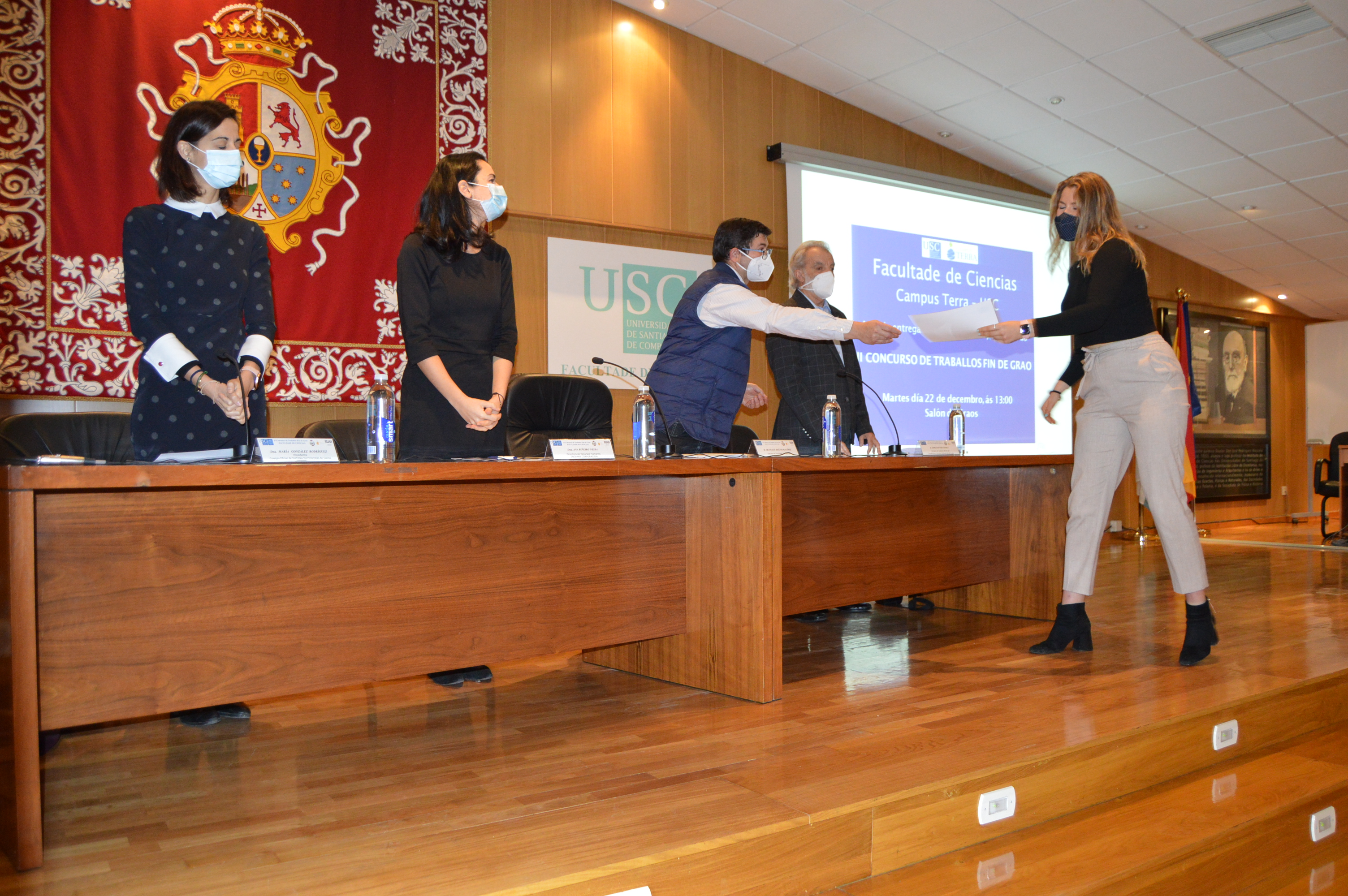 A cerimonia de entrega de premios do II Concurso de TFG da Facultade de Ciencias serviu asemade de recoñecemento público do interese doutros proxectos de fin de carreira desenvolvidos ao longo do último curso. Daquela, o xurado encargado de valorar as candidaturas recibidas do grao de Enxeñaría en Procesos Químicos Industriais, distinguiu co segundo premio, dotado con 500 euros, o proxecto presentado por Nerea Pena Vigo baixo o título ‘Proxecto de planta de produción de cremas cosméticas’. O TFG ‘Deseño e selección de equipos para unha planta de produción de iogur ecolóxico’, elaborado por Álex Veiga Castro, mereceu o terceiro premio, que inclúe unha gratificación de 300 euros por parte do Colexio Oficial de Enxeñeiros Técnicos Industriais de Lugo. Asemade, Gabriel Louro Gómez tamén recibiu un diploma acreditativo polo TFG ‘Proxecto de planta de pasteurización e envasado de leite para granxa ecolóxica’.