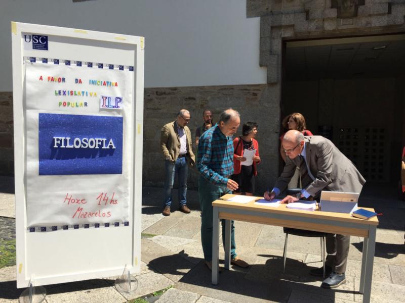 Persoal docente e estudantado da Facultade de Filosofía da USC recolleu este mediodía sinaturas en favor da Iniciativa Lexislativa Popular (IPL) presentada no Parlamento de Galicia hai un mes por un grupo de docentes en reivindicación da Filosofía no ensino medio.