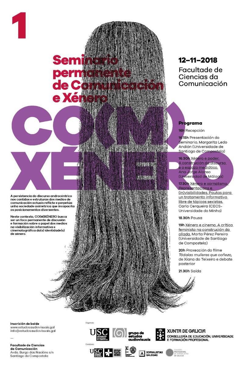 A Facultade de Ciencias da Comunicación da USC acollerá o luns 12 a primeira sesión do CO(M)XÉNERO, o Seminario Permanente de Comunicación e Xénero que organiza o Grupo de Estudos Audiovisuais (GEA). Dirixido por Margarita Ledo Andión, catedrática de Ciencias de Comunicación e Publicidade da USC e coordinadora do GEA, o seminario CO(M)XÉNERO busca ser un foco permanente de discusión e formación sobre o papel dos medios na vertebración da sociedade, con especial atención á visibilización informativa e cinematográfica da(s) identidade(s) de xénero. Nesta andadura conta coa colaboración da Xunta de Galicia, a Oficina de Igualdade de Xénero da USC, o programa Territorio das Mulleres, a Asociación Xornalistas Galegas e o Colexio Profesional de Xornalistas de Galicia.